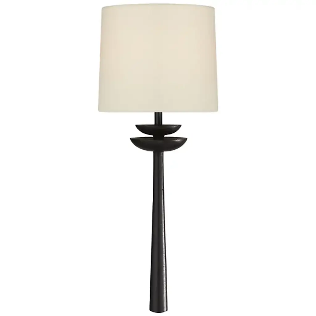 Representing pure tranquility. Evoking the pointy features of a pagoda, the Beaumont Wall Sconce from Visual Comfort Signature, formerly known as Visual Comfort, refines its decoration for a clean, welcoming visual. This sconce’s sculpted forms translate well in the contemporary setting. Made from metal, the linear structure guide’s one’s eyes up with a tapered quality. A pair of dish-like accents on top jump visually from the wall in their pointy notes and gentle curves. The linen shade on top keeps it classic with a deep drum form. The light exits out vertically to create a fountain of highlights on the structure and passes through the shade as a warm aura.