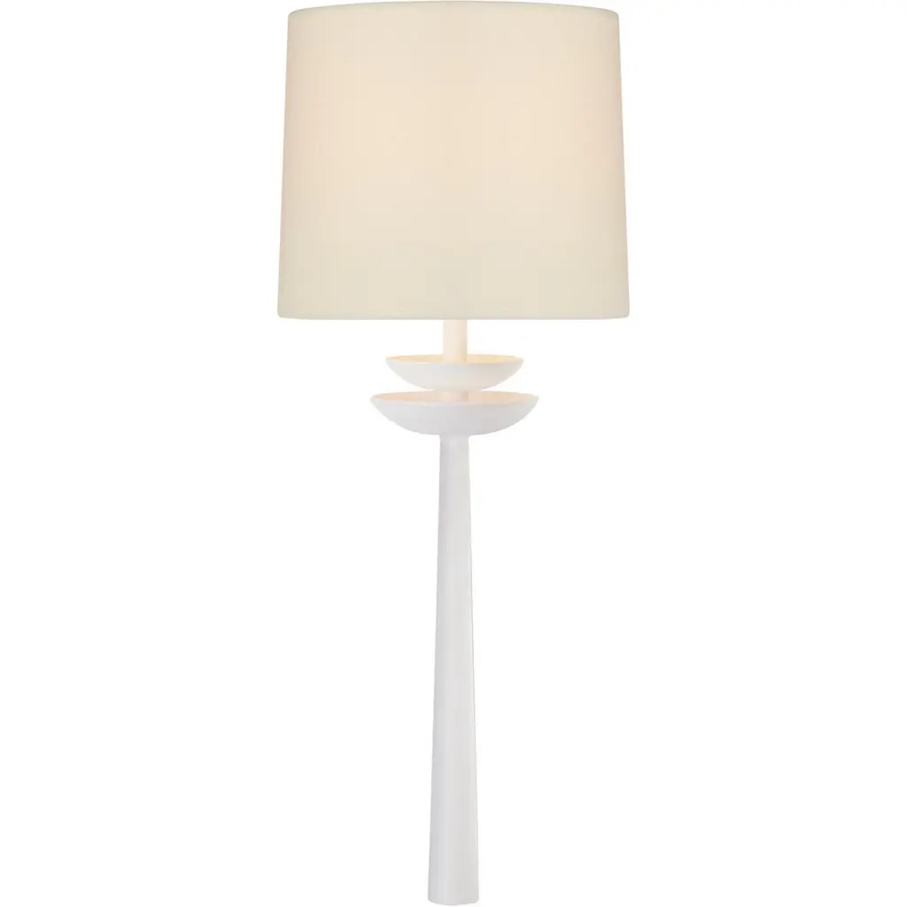 Representing pure tranquility. Evoking the pointy features of a pagoda, the Beaumont Wall Sconce from Visual Comfort Signature, formerly known as Visual Comfort, refines its decoration for a clean, welcoming visual. This sconce’s sculpted forms translate well in the contemporary setting. Made from metal, the linear structure guide’s one’s eyes up with a tapered quality. A pair of dish-like accents on top jump visually from the wall in their pointy notes and gentle curves. The linen shade on top keeps it classic with a deep drum form. The light exits out vertically to create a fountain of highlights on the structure and passes through the shade as a warm aura.