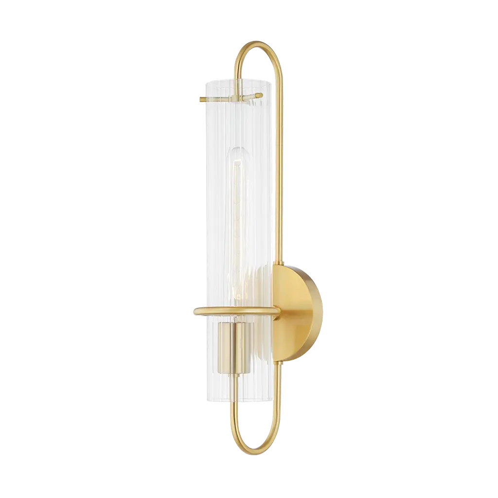 Beck takes Art Deco forms and gives them a modern minimalist aesthetic. Curved metal arms from the top and bottom of the backplate flow into a slender cylinder of fluted glass. A ring in matching aged brass or polished nickel wraps around the glass shade which holds a single Edison bulb. Beck is an ideal bath piece, but this sophisticated sconce will add a soft glow to other areas of the home as well.