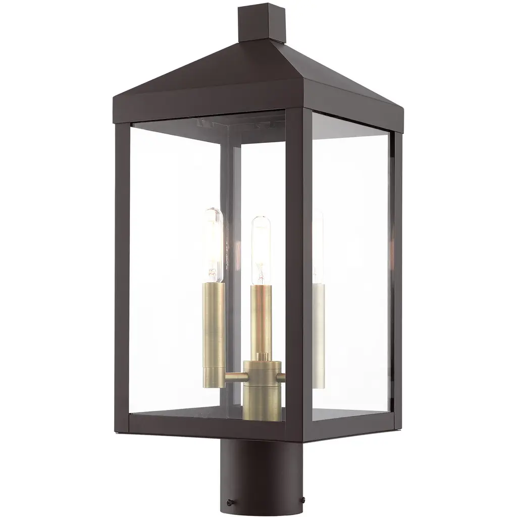 A slender, metal framework with clean, modern lines pairs with large panels of clear glass and classic candlestick bulbs to form this stately exterior wall sconce, pendant, and post. The visible rectangular backplate reflects light beautifully and both the Forged Iron and Texture Bronze finishes bring an added elegance to any outdoor setting.