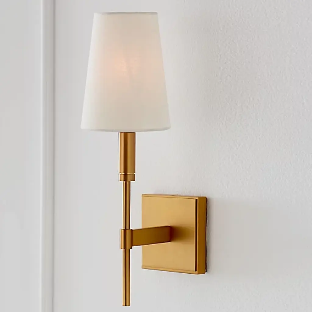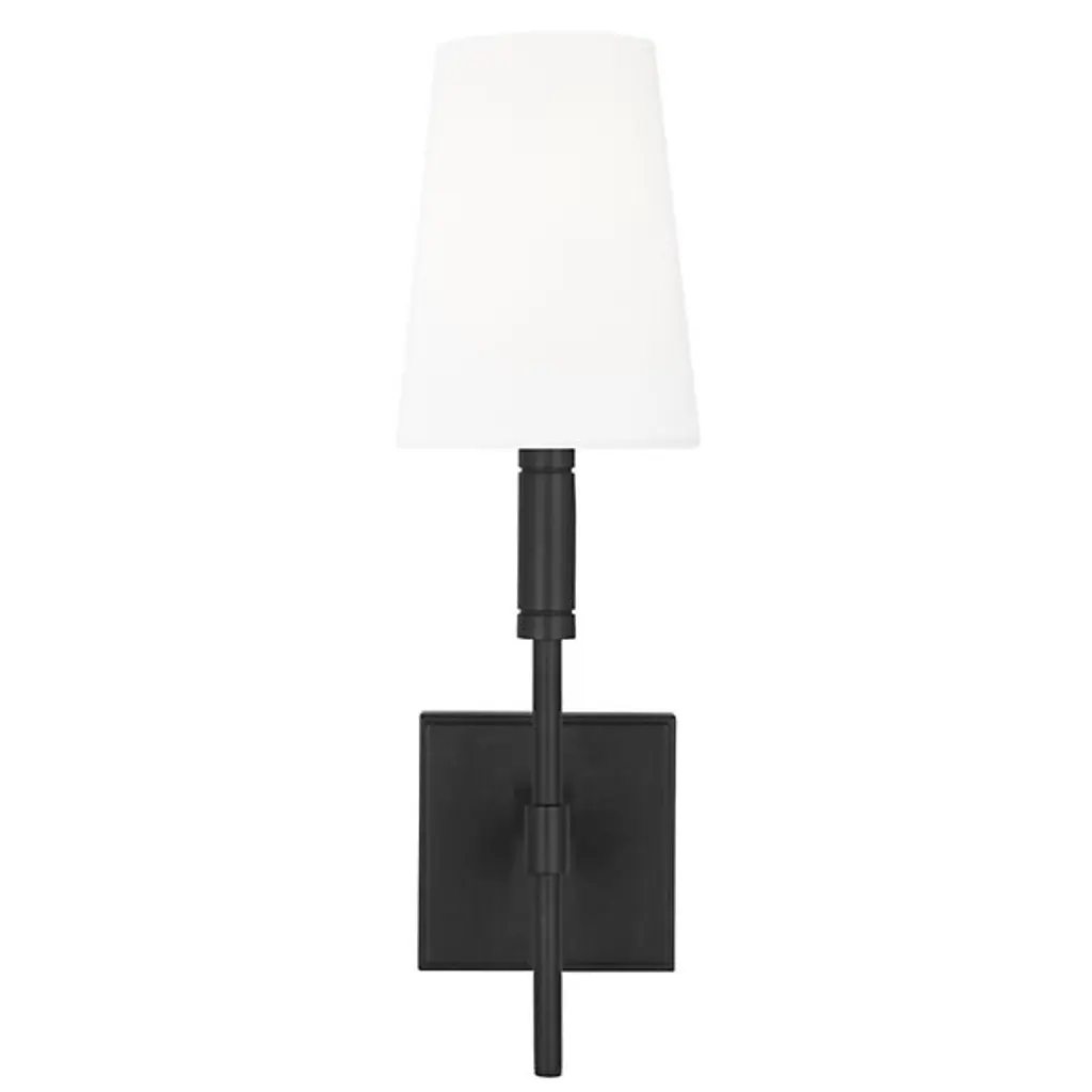 Familiar yet luxurious style. The Beckham Classic Wall Sconce from Visual Comfort Studio, formerly known as TOB by Thomas OBrien, has a traditional look, a common one you’ll find among wall sconces, but has some rich detailing that causes it to stand out. Its subdued style allows it to work in a variety of settings. The details reside on the slender stem, which his held out from the square backplate by a slim arm, to display its distinctive quality. It’s made out of Steel, so it will have the strength required of it to light up bathrooms, living rooms, and bedrooms for a long time. It comes with a drum-shaped and tapered shade made from White Linen Glass.