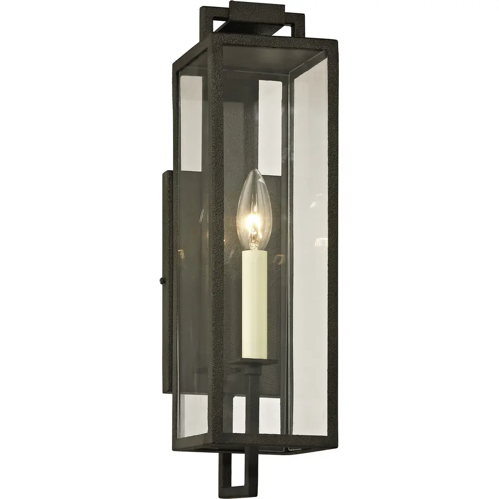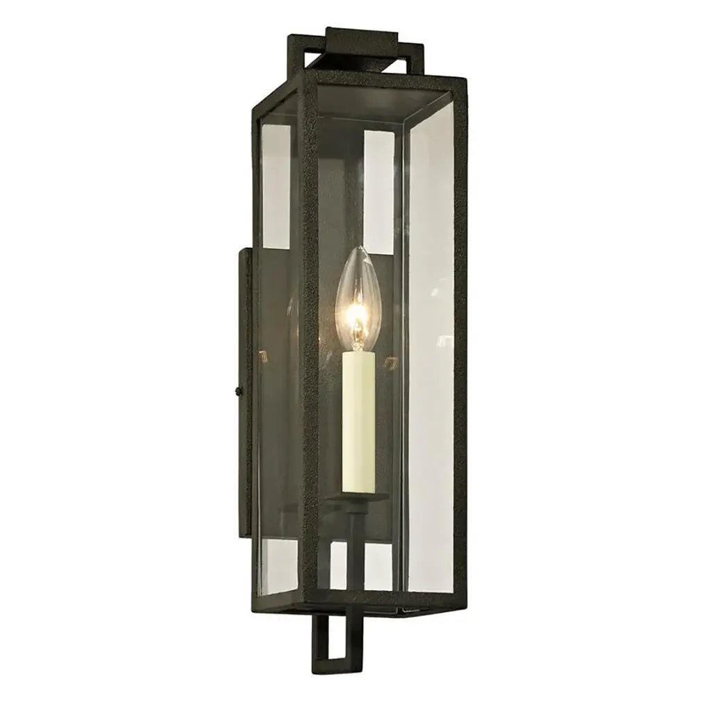 The Beckham Small Outdoor Wall Sconce from Troy Lighting enhances your outdoor space with this stately collection of exterior lighting. A slender metal framework characterized by clean, modern lines combines seamlessly with expansive panels of clear glass and classic candlestick bulbs. This design harmoniously marries sophistication and simplicity. The rectangular backplate, visible and reflective, enhances the play of light. It contributes an extra layer of elegance to any outdoor setting, making this collection an ideal choice for enhancing your outdoor ambiance with style and brilliance.