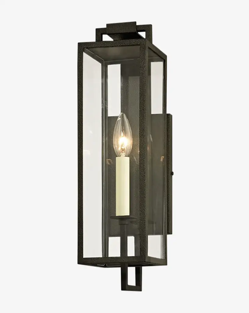 The Beckham Wall Sconce is a modern yet industrial cage lantern with a streamlined design. A metal structure with either a forged iron or textured bronze finish frames glass panels to reveal the candle-inspired bulbs. Beautiful from each angle, the sconce brings subtly warm light to your outdoor spaces.