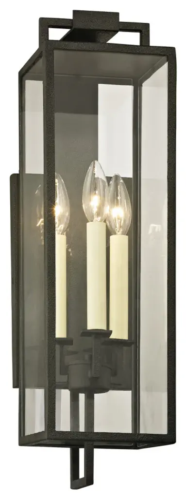 The Beckham Wall Sconce is a modern yet industrial cage lantern with a streamlined design. A metal structure with either a forged iron or textured bronze finish frames glass panels to reveal the candle-inspired bulbs. Beautiful from each angle, the sconce brings subtly warm light to your outdoor spaces.