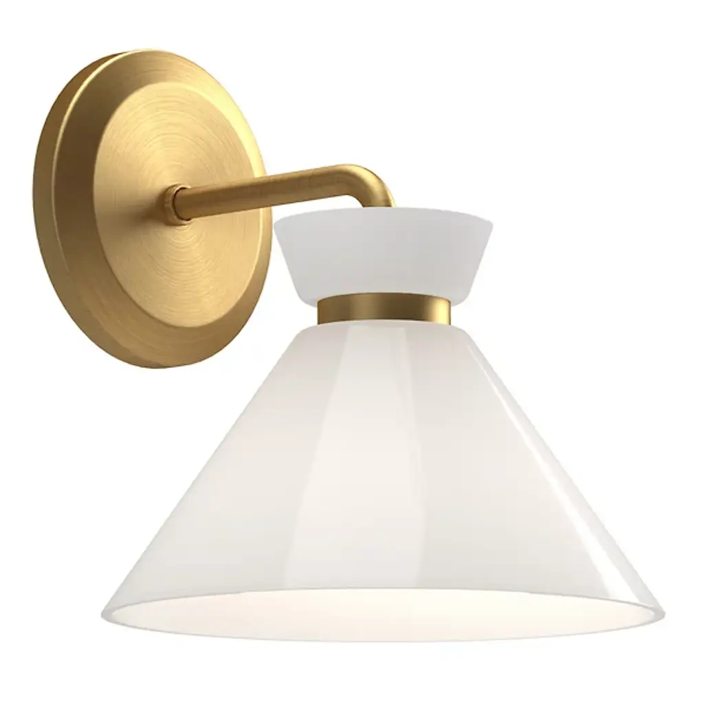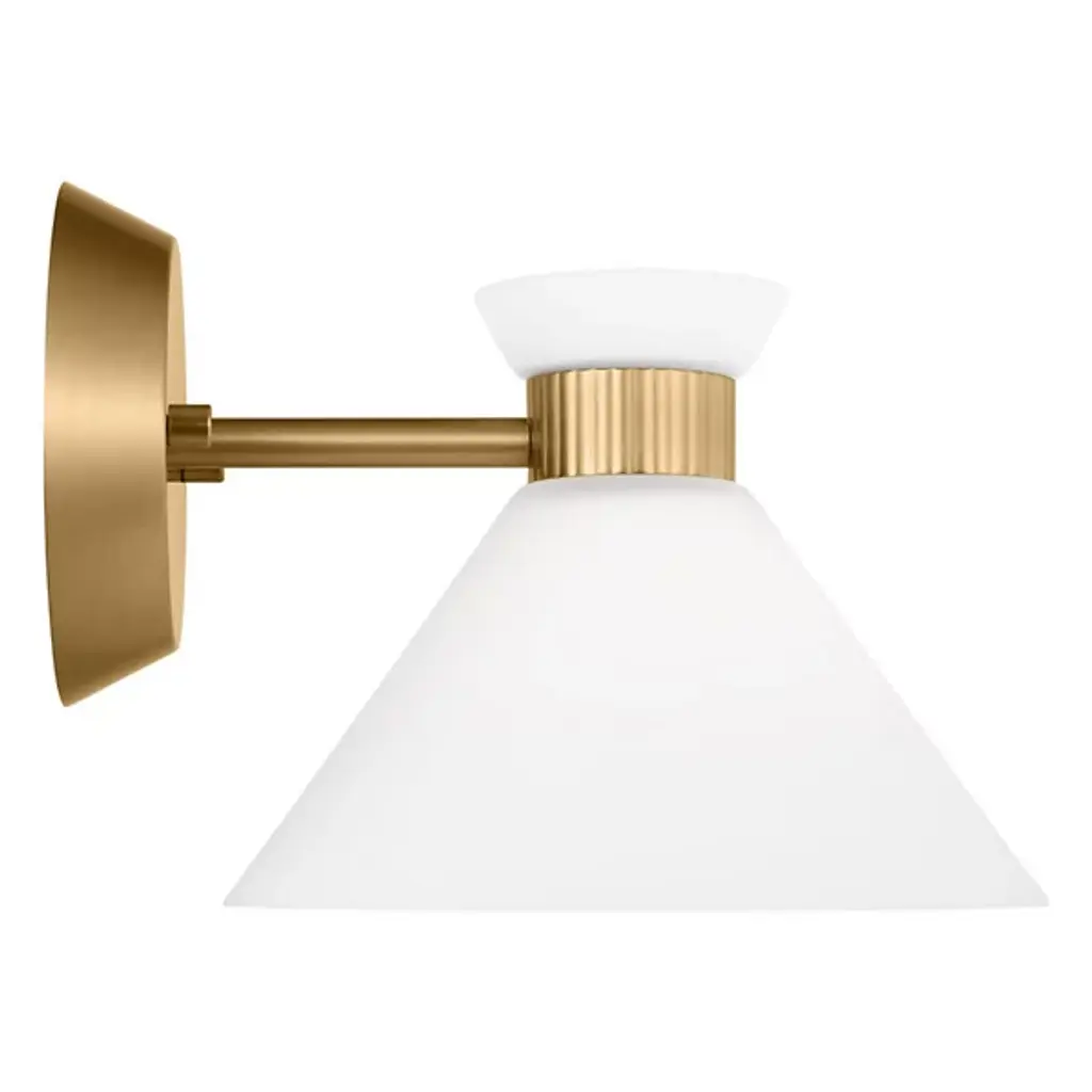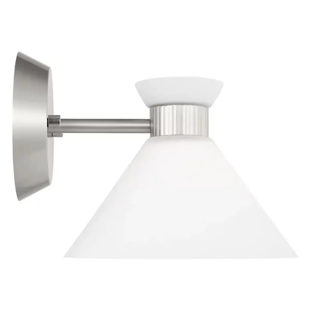The Belcarra Wall Sconce from Visual Comfort Studio Illuminates your space in soft-spoken elegance. This transitional light fixture features a conically shaped shade of glass held by a slim steel arm. The glass shade gently tempers the LED, emitting a useful glow for hallways, bedrooms, and reading areas. A round metal backplate provides a clean point of contact with the wall. When you use an ELV dimmer, you can quickly adjust the sconce’s brightness level.