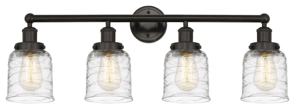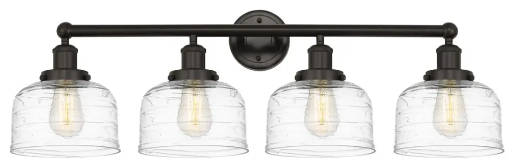 INNOVATIONS 616-4W-OB-G52 Bell 4 Light 33.5 inch Bath Vanity Light Oil Rubbed Bronze. Style: Art Nouveau, Industrial, Restoration-Vintage, Transitional . Collection Name: Edison. Metal Finish(Body): Oil Rubbed Bronze. Metal Finish(Canopy/Backplate): Oil Rubbed Bronze. Material: Steel, Cast Brass, Glass. Dimension(in): 11(H) x 32(W) x 7(Ext). Bulb: (4)60W Medium Base Incandescent(Not Included). Voltage: 120. Dimmable: Yes. Color Temperature (Kelvin): 2200. Color Rendering Index (CRI): 99.9. Lumens: 220. Life Expectancy (Hours): 2000. Glass Shade Description: Clear Bell. Glass Type: Transparent; Ribbed. Shade Shape: Bowl. Glass or Metal Shade Color: Clear. Shade Material: Glass. Shade Dimension(in): 5(W) x 5.75(H). Fitter Measurement (Glass Or Metal Shade Fitter Size): 3.25 inch Fitter. Backplate Dimension(in): 4.5(W) x 0.75(Depth). ADA Compliant: No. California Proposition 65 Warning Required: Yes. UL/ETL Certification Type: Damp Location.