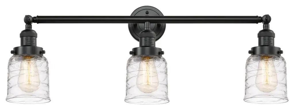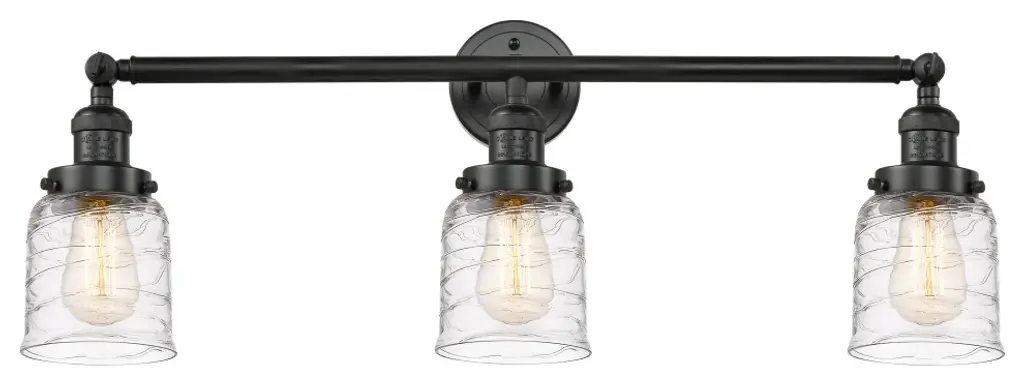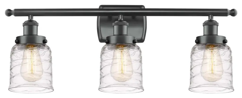 INNOVATIONS 616-4W-OB-G513 Bell 4 Light 33.5 inch Bath Vanity Light Oil Rubbed Bronze. Style: Art Nouveau, Industrial, Restoration-Vintage, Transitional . Collection Name: Edison. Metal Finish(Body): Oil Rubbed Bronze. Metal Finish(Canopy/Backplate): Oil Rubbed Bronze. Material: Steel, Cast Brass, Glass. Dimension(in): 11(H) x 32(W) x 7(Ext). Bulb: (4)60W Medium Base Incandescent(Not Included). Voltage: 120. Dimmable: Yes. Color Temperature (Kelvin): 2200. Color Rendering Index (CRI): 99.9. Lumens: 220. Life Expectancy (Hours): 2000. Glass Shade Description: Clear Deco Swirl Bell Glass. Glass Type: Colorful; Ribbed. Shade Shape: Bowl. Glass or Metal Shade Color: Clear Deco Swirl. Shade Material: Glass. Shade Dimension(in): 5(W) x 5.75(H). Fitter Measurement (Glass Or Metal Shade Fitter Size): 3.25 inch Fitter. Backplate Dimension(in): 4.5(W) x 0.75(Depth). ADA Compliant: No. California Proposition 65 Warning Required: Yes. UL/ETL Certification Type: Damp Location.