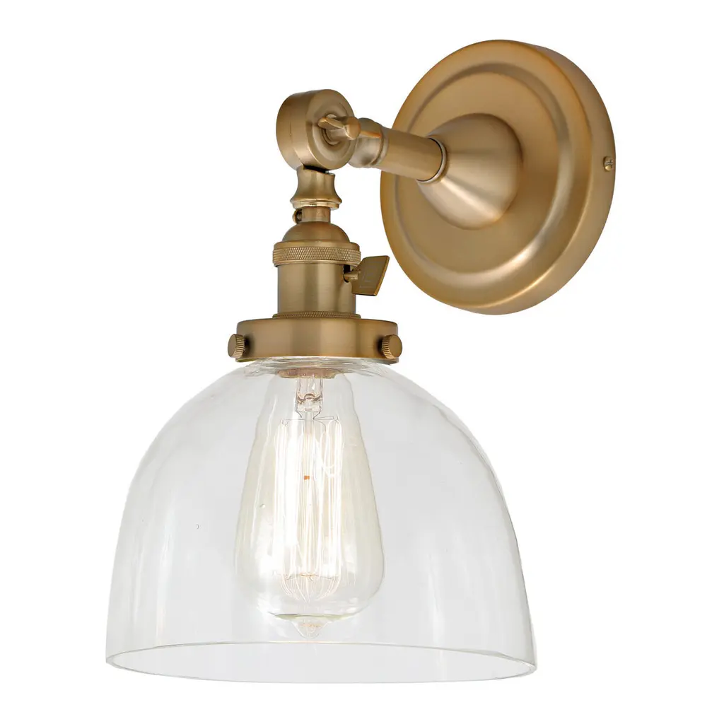 One of our largest and original collections, the Franklin Restoration is made up of a vast selection of heavy metal finishes and a large array of metal and glass shades that bring a touch of industrial into your home.Features:Solid brass 180 degree adjustable swivels with internal teeth that lock in at 5 degree intervalsFixture can be hung with bulbs facing up or down as a wall mount or facing down as a ceiling mount7.875" x 4.5" 2mm heavy cast backplateDistance from outlet opening to top of fixture 7.06 inchesRated for 100 watt maximumUL/CUL Damp RatedCompatible with Incandescent, LED, Fluorescent and Halogen bulbsThe arm swivels side to side at the baseNumber of Bulbs: 1Bulb Wattage: 60Bulb Type: IncandescentBulb Included: Not IncludedVoltage: 120Finish: Antique Brass Finish Shade Finish: Clear Shade.
