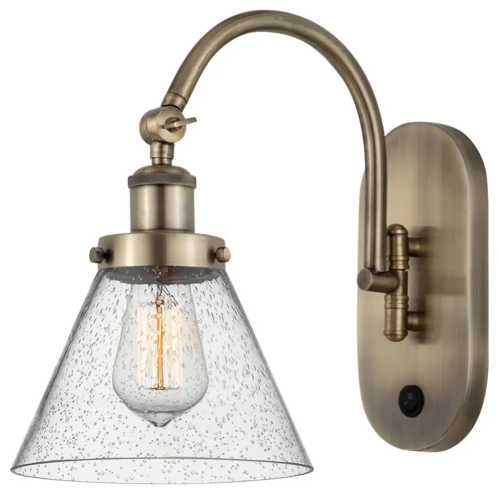 One of our largest and original collections, the Franklin Restoration is made up of a vast selection of heavy metal finishes and a large array of metal and glass shades that bring a touch of industrial into your home.Features:Solid brass 180 degree adjustable swivels with internal teeth that lock in at 5 degree intervalsFixture can be hung with bulbs facing up or down as a wall mount or facing down as a ceiling mount7.875" x 4.5" 2mm heavy cast backplateDistance from outlet opening to top of fixture 7.06 inchesRated for 100 watt maximumUL/CUL Damp RatedCompatible with Incandescent, LED, Fluorescent and Halogen bulbsThe arm swivels side to side at the baseNumber of Bulbs: 1Bulb Wattage: 60Bulb Type: IncandescentBulb Included: Not IncludedVoltage: 120Finish: Antique Brass Finish Shade Finish: Plated Smoke Shade