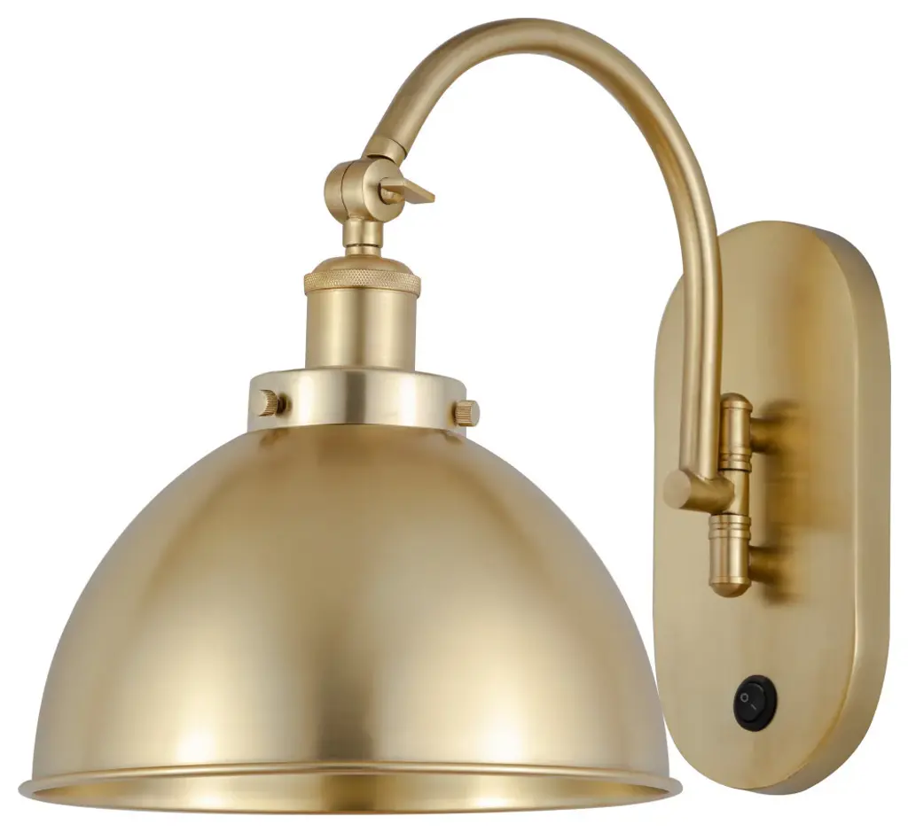 One of our largest and original collections, the Franklin Restoration is made up of a vast selection of heavy metal finishes and a large array of metal and glass shades that bring a touch of industrial into your home.Features:Solid brass 180 degree adjustable swivels with internal teeth that lock in at 5 degree intervalsFixture can be hung with bulbs facing up or down as a wall mount or facing down as a ceiling mount7.875" x 4.5" 2mm heavy cast backplateDistance from outlet opening to top of fixture 7.06 inchesRated for 100 watt maximumUL/CUL Damp RatedCompatible with Incandescent, LED, Fluorescent and Halogen bulbsThe arm swivels side to side at the baseNumber of Bulbs: 1Bulb Wattage: 3.5Bulb Type: LEDBulb Included: IncludedVoltage: 120Finish: Brushed Brass Finish Shade Finish: Matte White Shade.