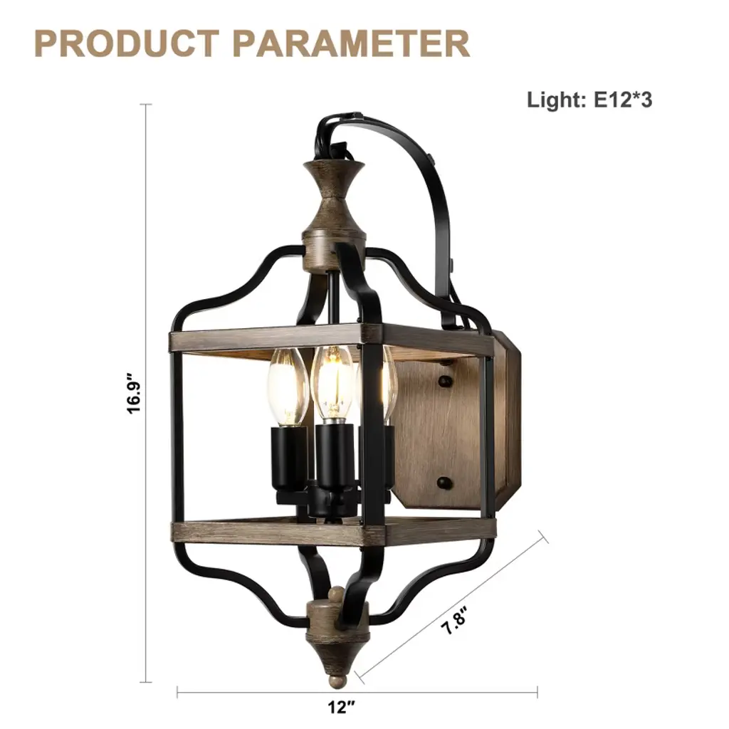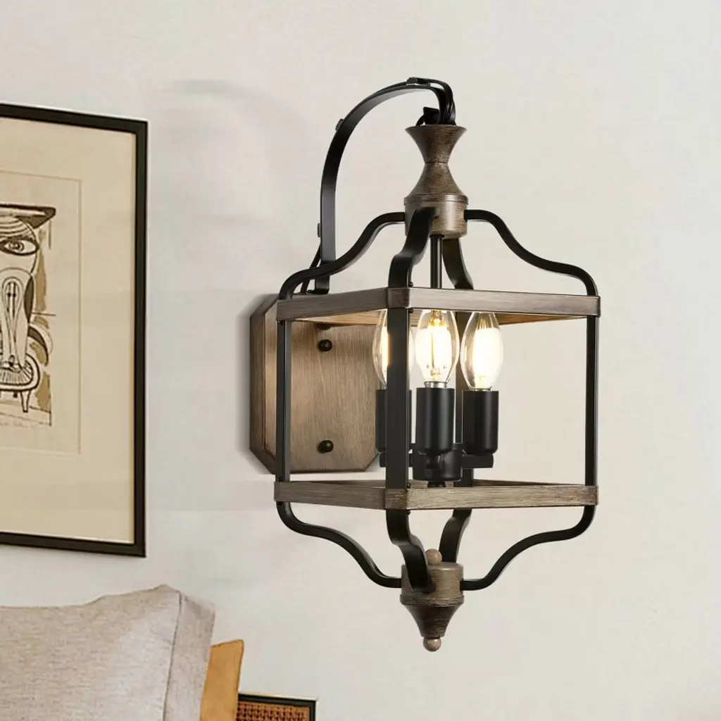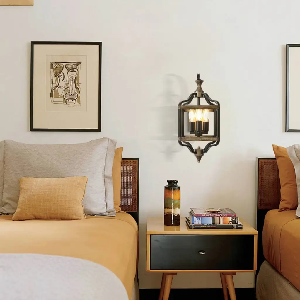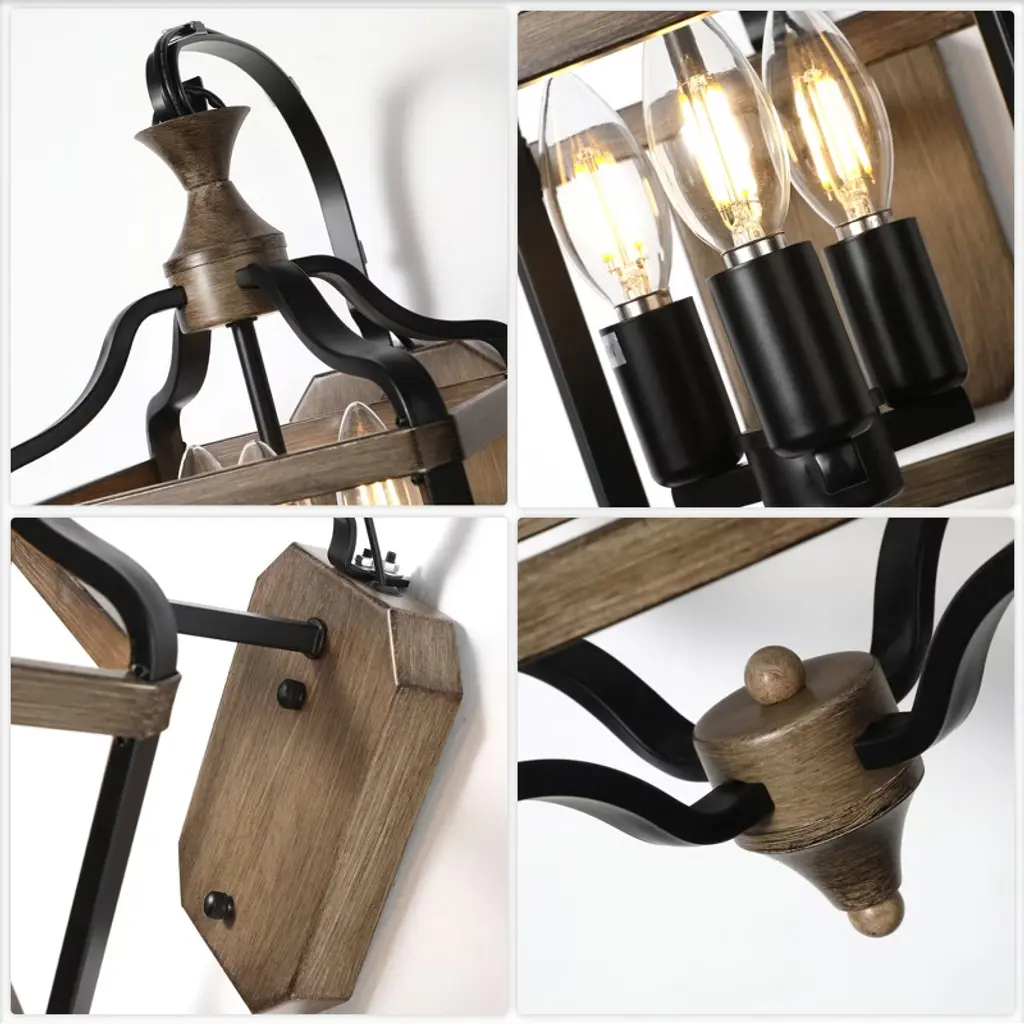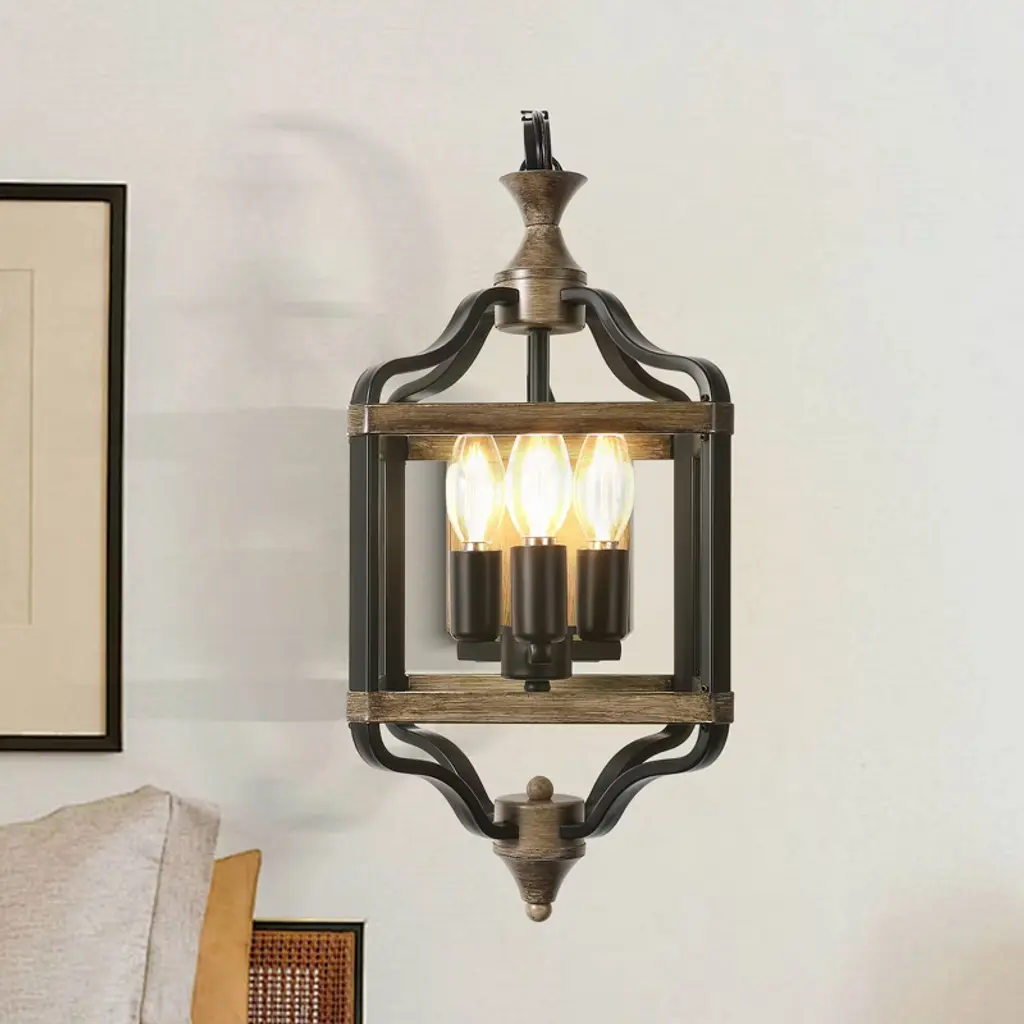Illuminate your space with charm and character using our captivating vintage-style lantern-shaped black wall sconce. Featuring four light fixtures nestled within a black metal frame and enhanced by distressed wooden lampshades, this fixture exudes a nostalgic allure that adds a touch of old-world elegance to any room. The simple installation and versatile design make it a seamless addition to a variety of interior design styles. Elevate your decor with this unique piece that effortlessly blends vintage aesthetics with modern functionality.