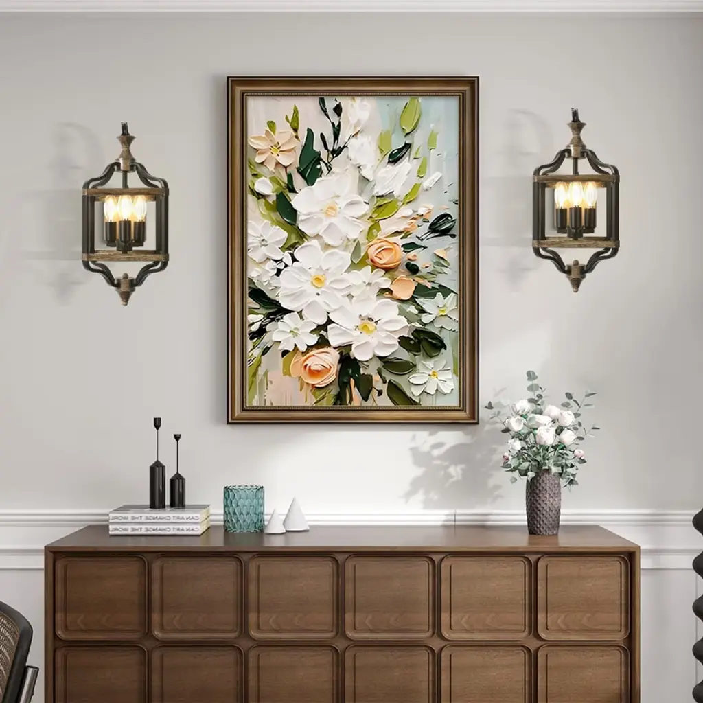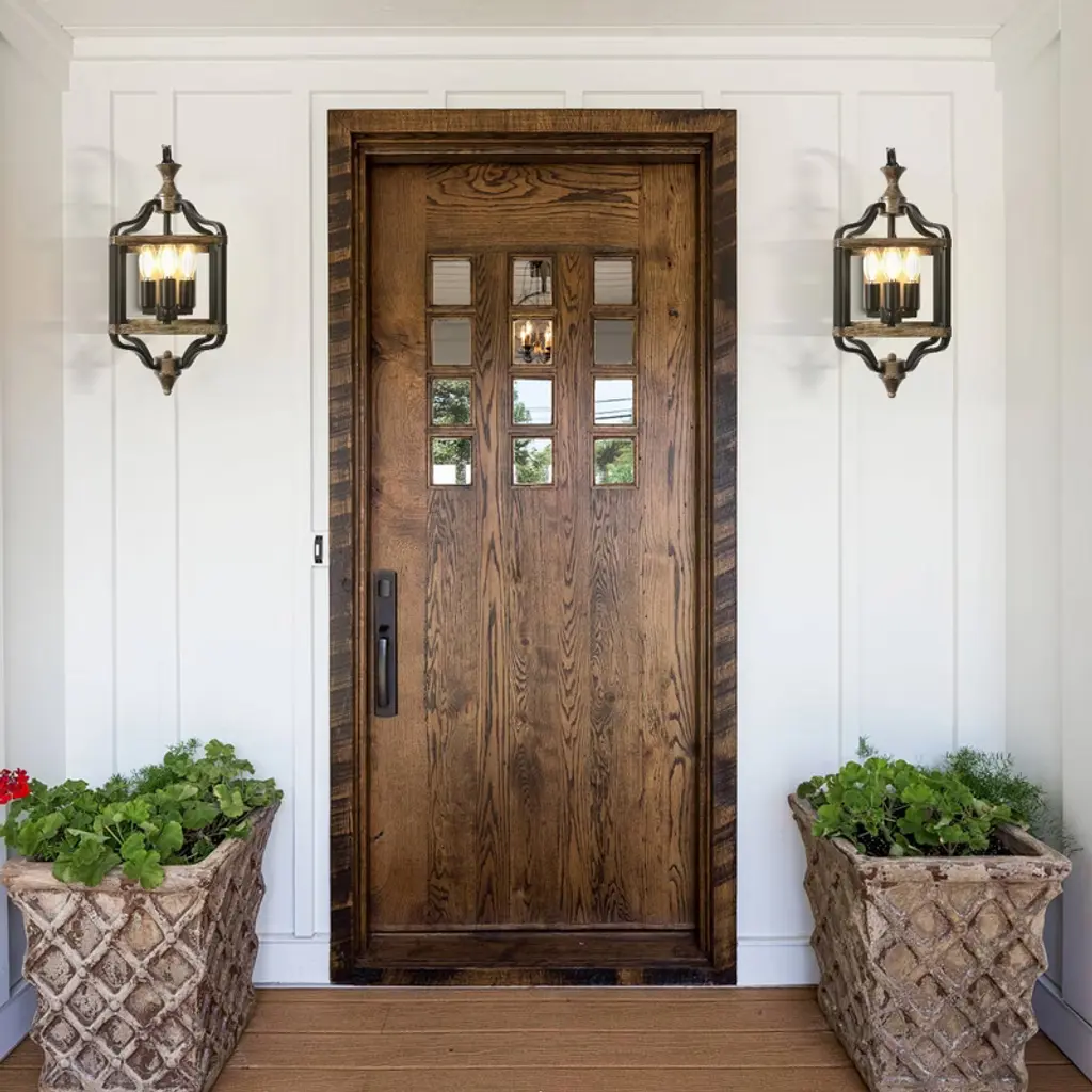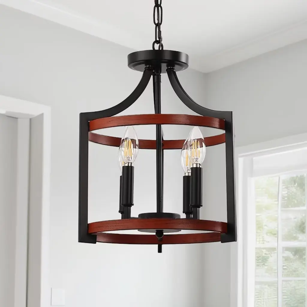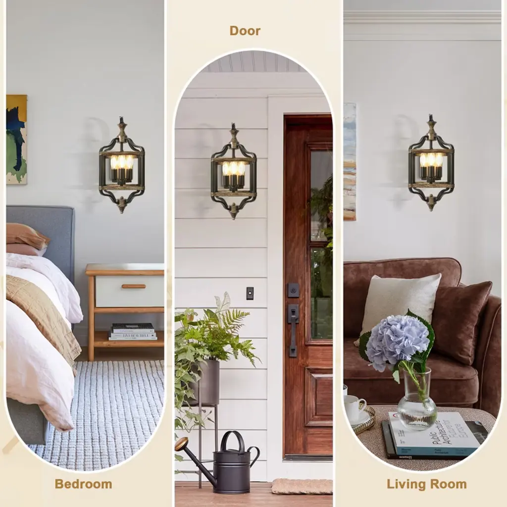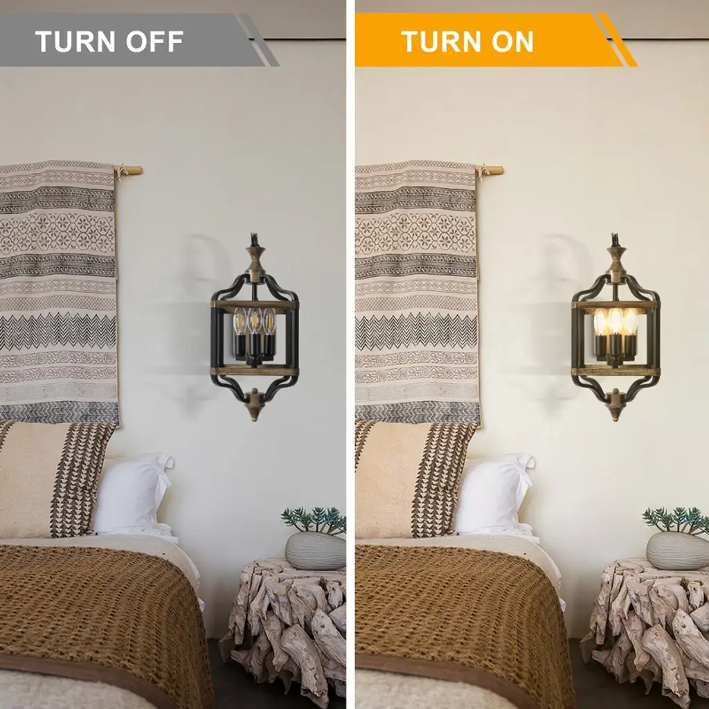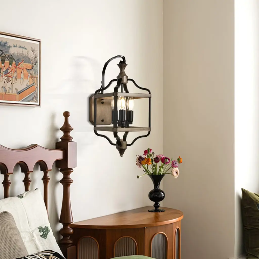 Illuminate your space with charm and character using our captivating vintage-style lantern-shaped black wall sconce. Featuring four light fixtures nestled within a black metal frame and enhanced by distressed wooden lampshades, this fixture exudes a nostalgic allure that adds a touch of old-world elegance to any room. The simple installation and versatile design make it a seamless addition to a variety of interior design styles. Elevate your decor with this unique piece that effortlessly blends vintage aesthetics with modern functionality.