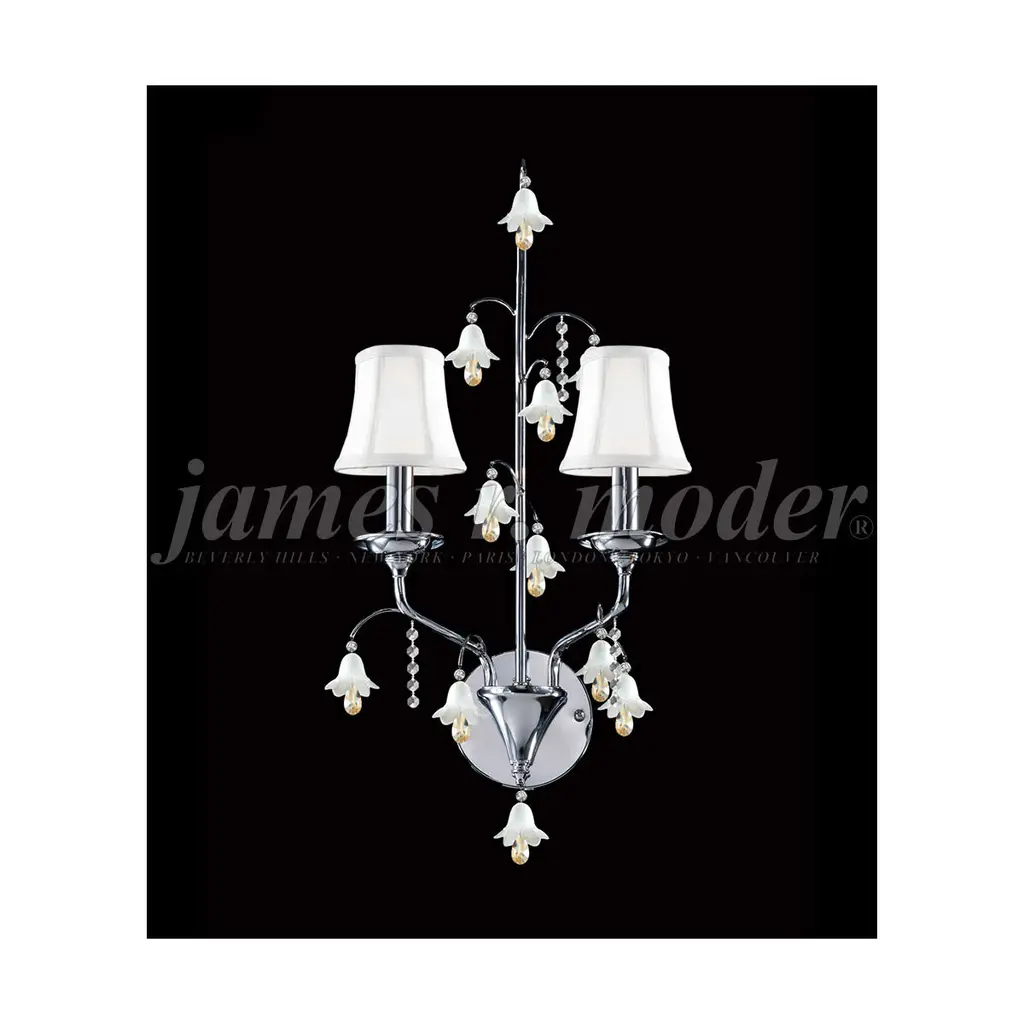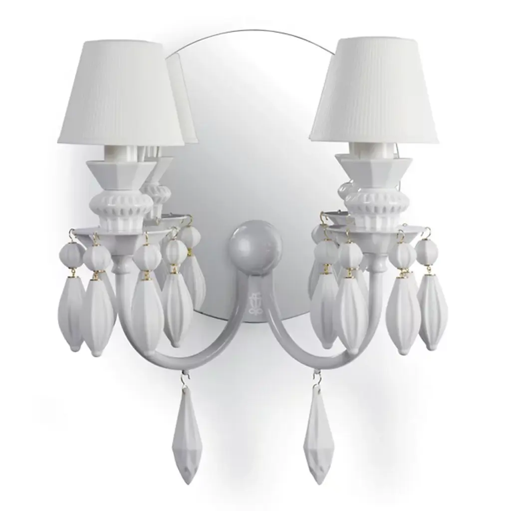 The Belle de Nuit Wall Sconce by Lladro was named and inspired by a species of striking plant whose petals appear to glow in the night as they reflect the moonlight. With a decorative back mirror, this design features a set of pleated, porcelain shades that come to life when illuminated, highlighting the rest of the porcelain construction below it. Gracefully curved arms feature decorative porcelain accents and the structure below each shade have their own sculptural, textural build that is dressed up with beautiful finishes for a dynamic touch.