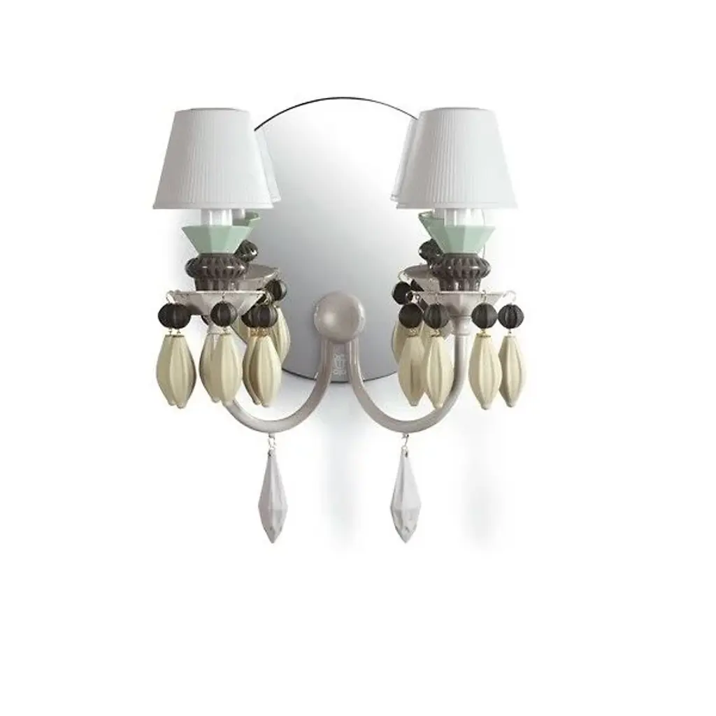 The Belle de Nuit Wall Sconce by Lladro was named and inspired by a species of striking plant whose petals appear to glow in the night as they reflect the moonlight. With a decorative back mirror, this design features a set of pleated, porcelain shades that come to life when illuminated, highlighting the rest of the porcelain construction below it. Gracefully curved arms feature decorative porcelain accents and the structure below each shade have their own sculptural, textural build that is dressed up with beautiful finishes for a dynamic touch.