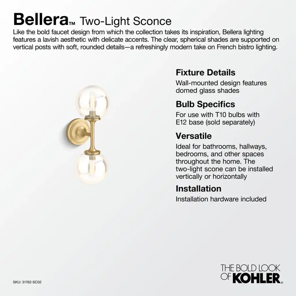 Distinguished by elegant, jewelry-inspired silhouettes, the Bellera lighting collection adds style and grace to the home with sconces, pendants, chandeliers, and flush mounts. Featuring clear glass globes, flared metal rods and bases, and intricate metal detailing, Bellera fixtures deliver versatility with a transitional style that easily flows with your entire home's aesthetic. Brilliant and functional, these pieces were created to complement the Kohler Bellera faucet collection.