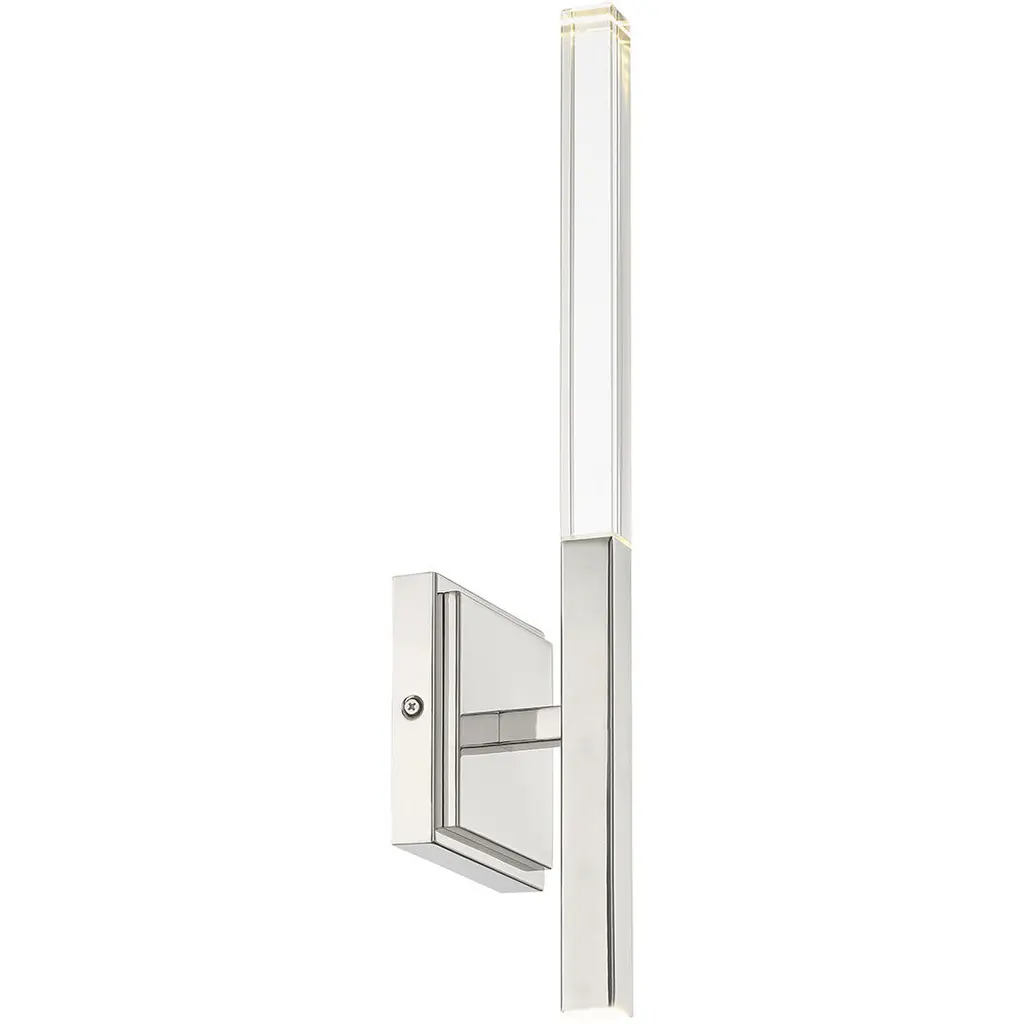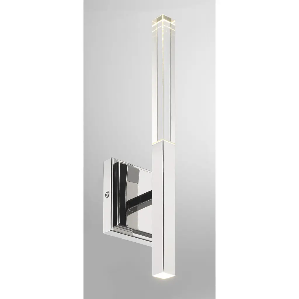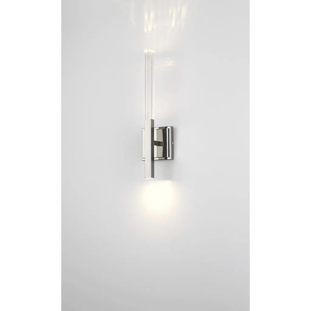 Its crystal rectangular prism and sharp beveled edges create brilliant illumination to the Benicio collection. Solid glass vertical spires cast vivid refractions across wall and ceiling surfaces. The thin simple geometric shape lends itself to luxurious and contemporary environments while providing a dual LED light source.