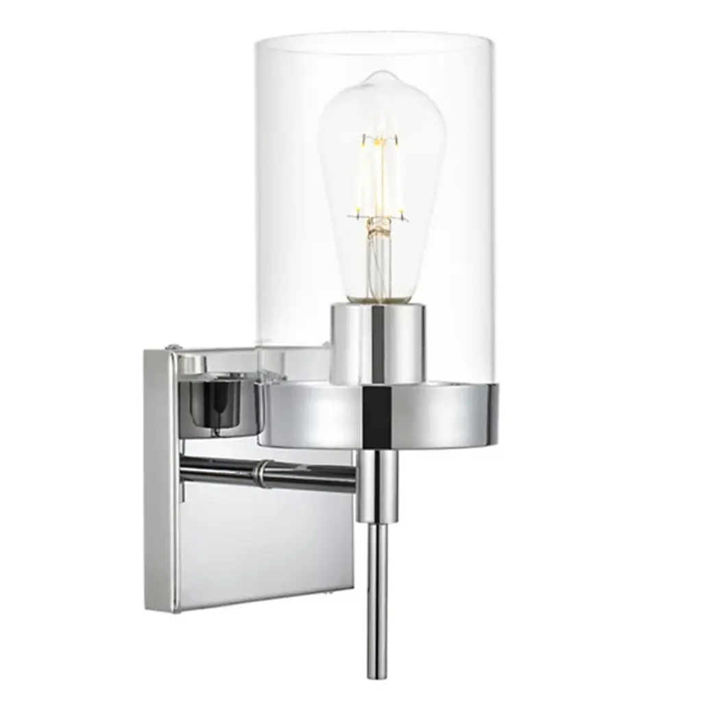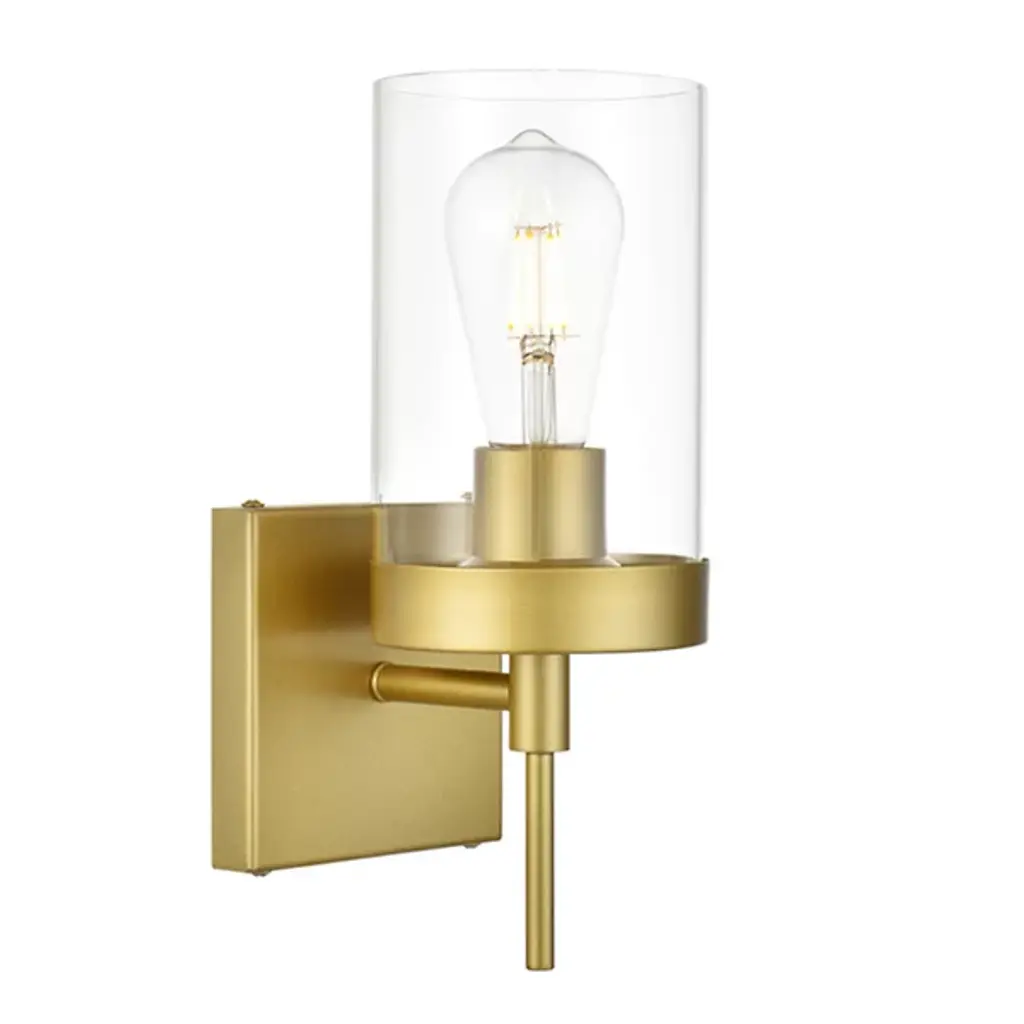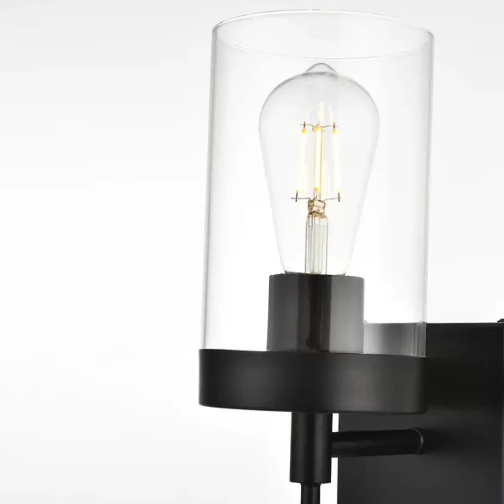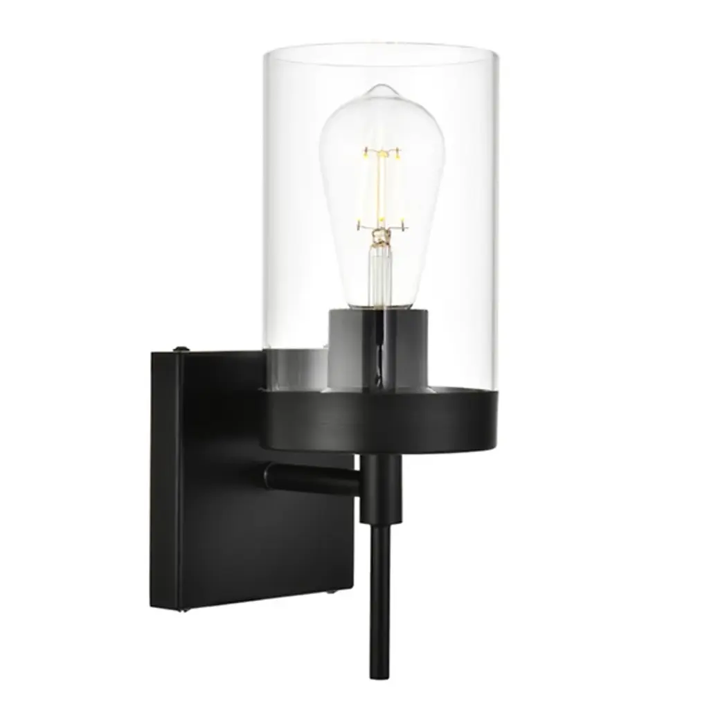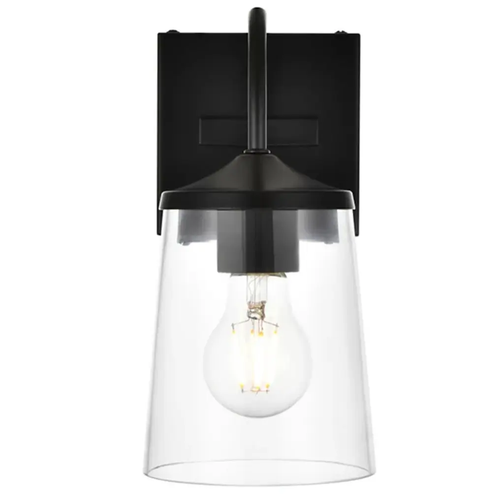 Radiating contemporary elegance, the Bennia Bath Sconce by Huxe boasts a curved metal arm supporting a clear bell glass shade. Its sleek design highlights straight-line details, from the backplate to the slender arm, infusing modernity into any setting. Compatible with dimmers, it offers adjustable lighting for different times of the day. With flexible placement options such as an uplight or downlight and a damp location rating, it's perfect for bathroom vanities, combining style with practicality seamlessly.