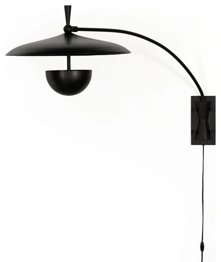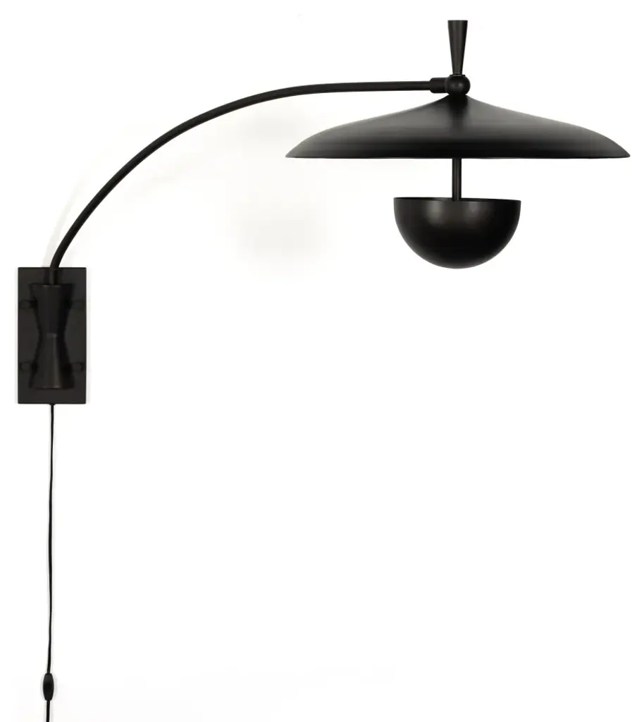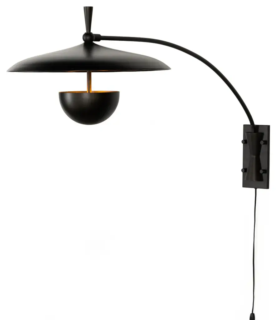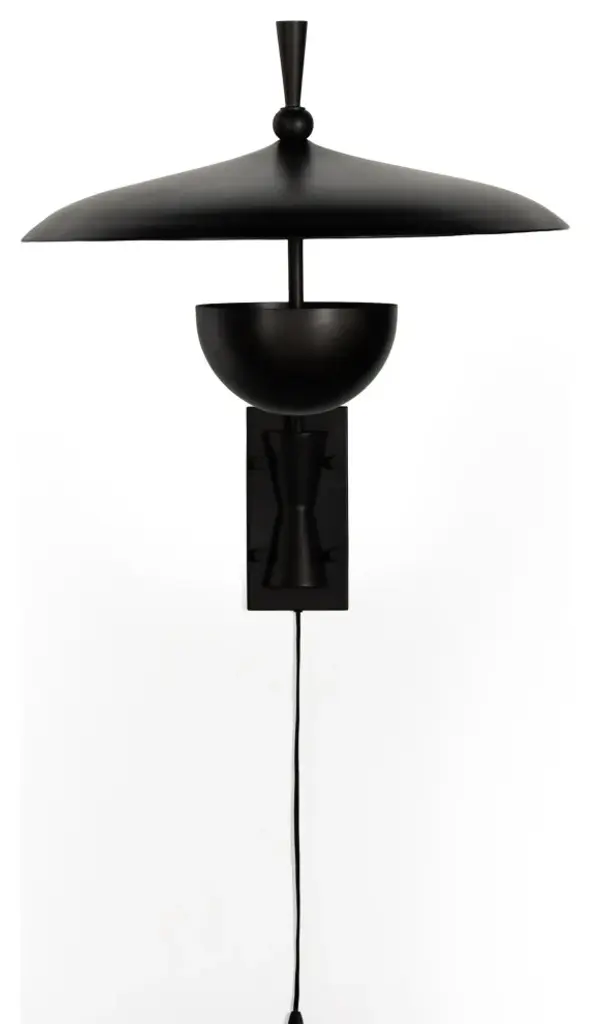 Make a dramatic style statement with a slim yet oversize iron sconce inspired by midcentury design. Light is located within lower dish so it illuminates upward.