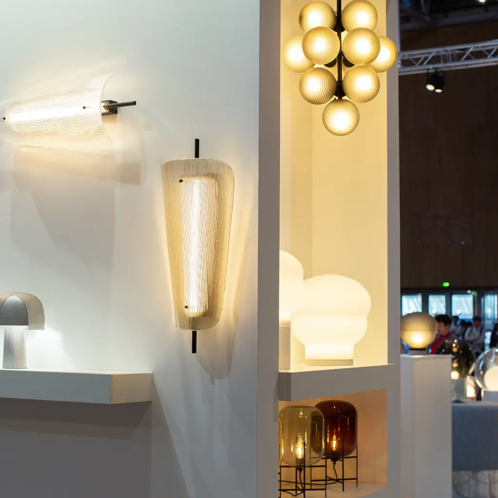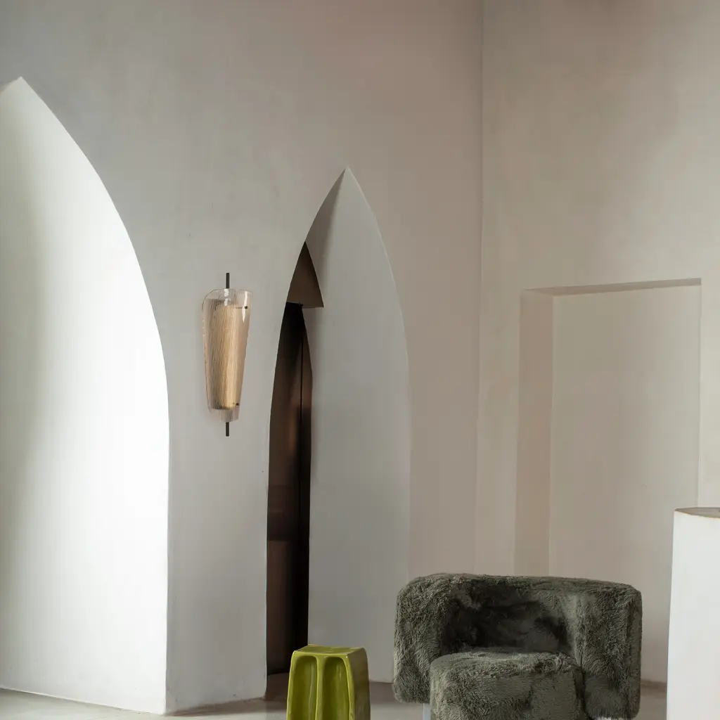 The Bent Wall Lamp features a curved glass shade that seamlessly integrates into the wall, casting a dynamic interplay of light and shadow. Each glass piece is handcrafted using traditional techniques, resulting in unique grooves and patterns that give it distinct character. The lamp is paired with a sturdy steel base and the shade is available in 2 different glass finishes, adding depth and texture to any space.