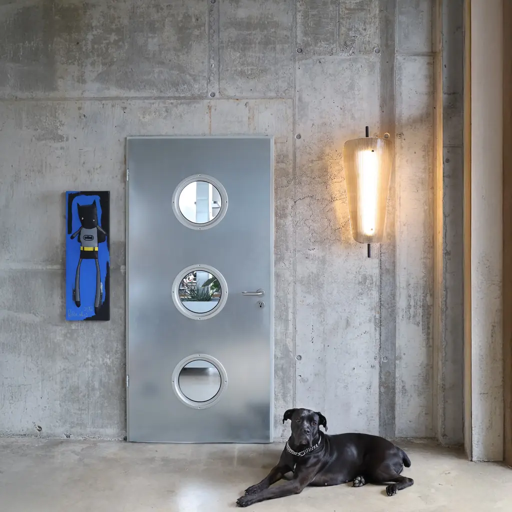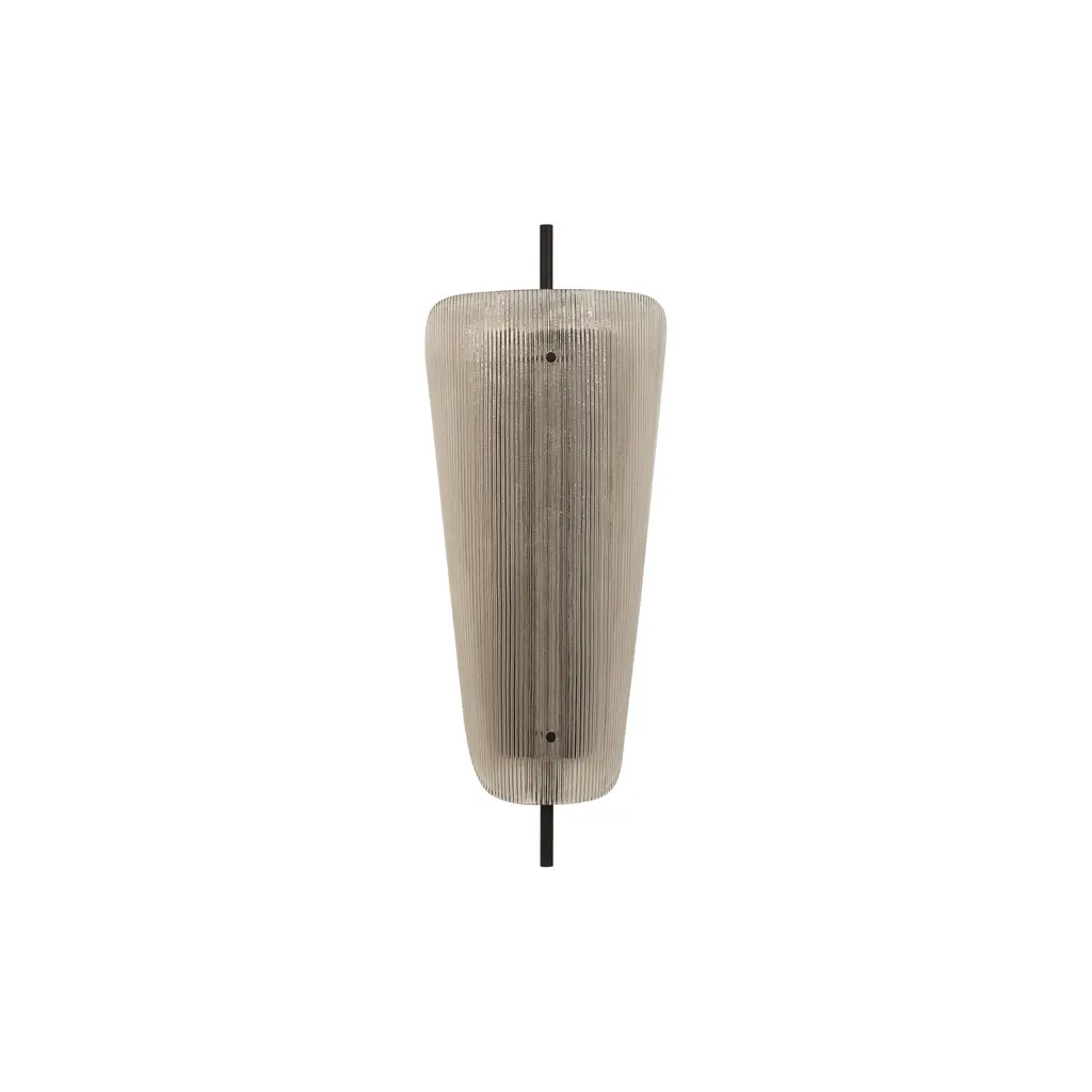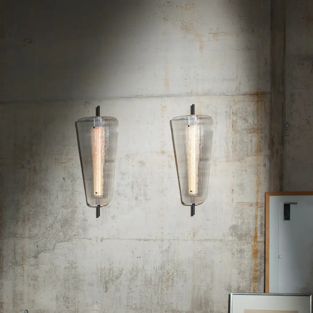 The Bent Wall Lamp features a curved glass shade that seamlessly integrates into the wall, casting a dynamic interplay of light and shadow. Each glass piece is handcrafted using traditional techniques, resulting in unique grooves and patterns that give it distinct character. The lamp is paired with a sturdy steel base and the shade is available in 2 different glass finishes, adding depth and texture to any space.