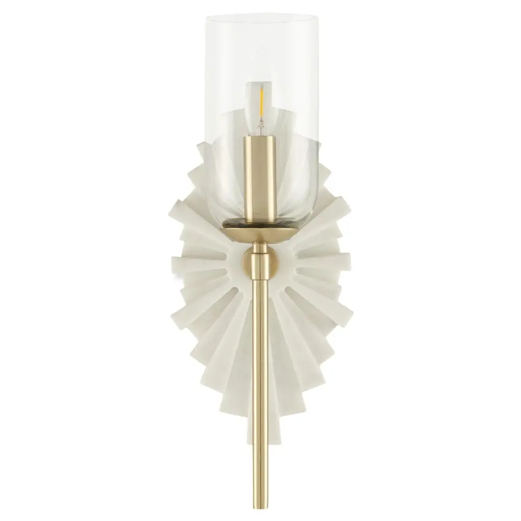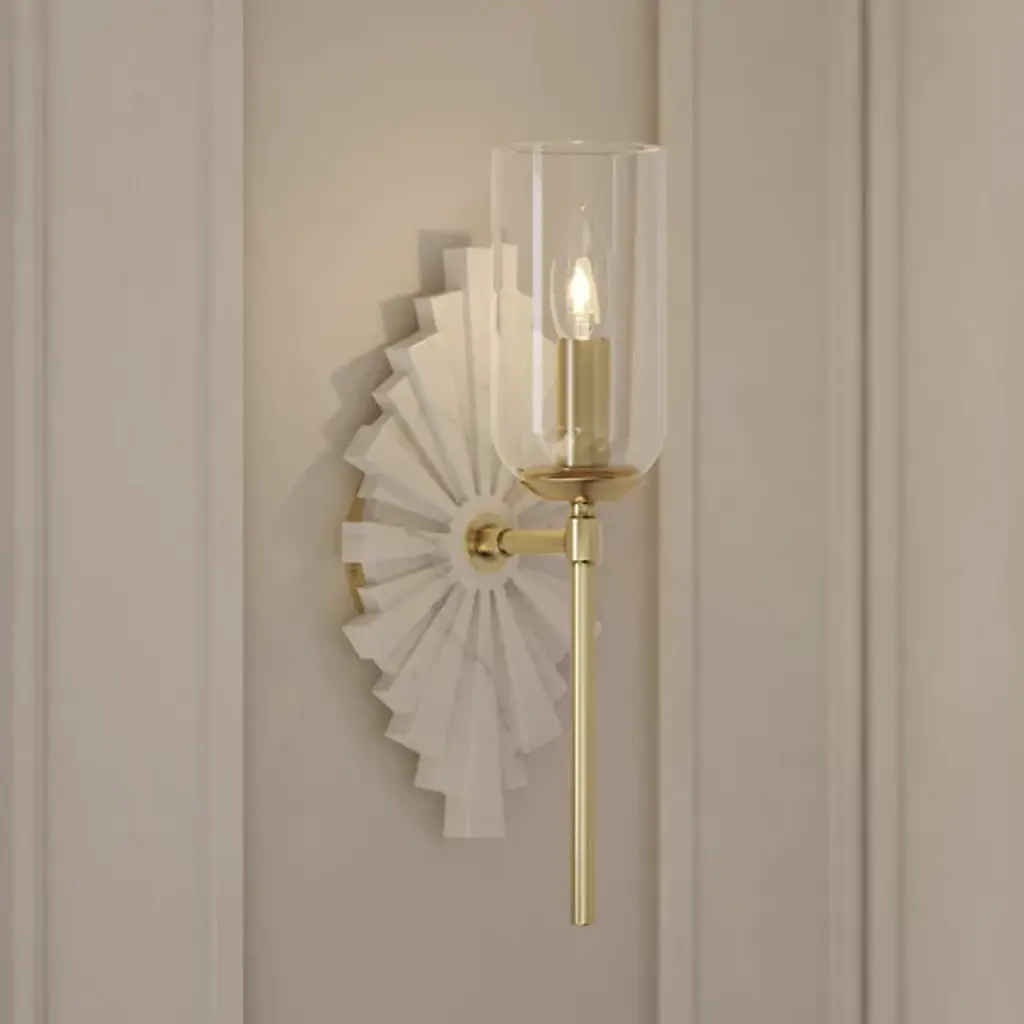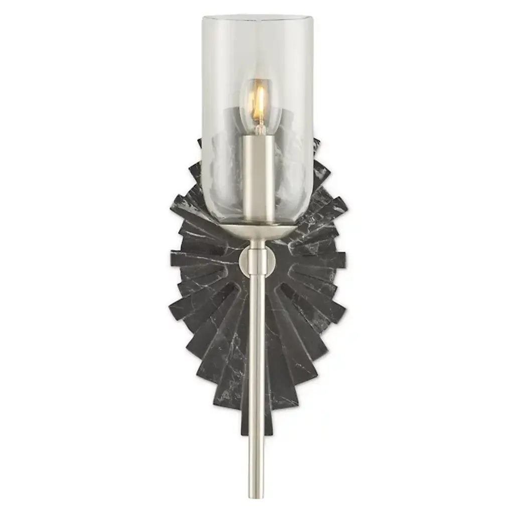 The Benthos Wall Sconce from Crystorama, thoughtfully designed by Ian Thornton, features a stunning starburst pattern on its wall plate, skillfully crafted from Marquino marble. The nickel finish on the metal elegantly accentuates the natural veining running through the marble, adding to its allure. This sconce is part of Crystorama's Bagno Collection, specially designed for damp-rated bathroom lighting. Each sconce may exhibit unique variations as a natural material, further enhancing its individuality and beauty.