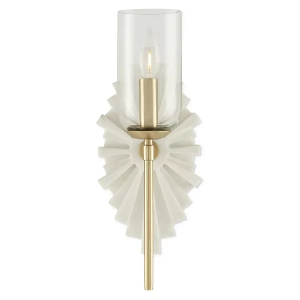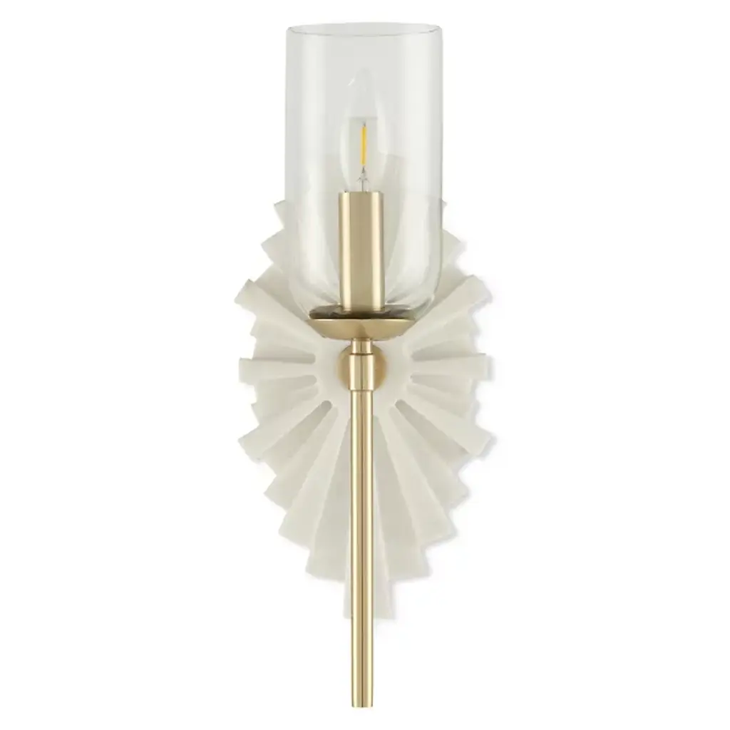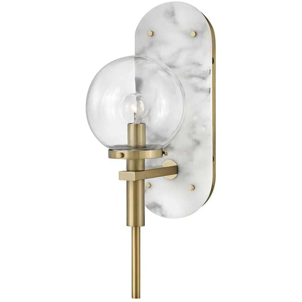 The Benthos Wall Sconce from Crystorama, thoughtfully designed by Ian Thornton, features a stunning starburst pattern on its wall plate, skillfully crafted from Marquino marble. The nickel finish on the metal elegantly accentuates the natural veining running through the marble, adding to its allure. This sconce is part of Crystorama's Bagno Collection, specially designed for damp-rated bathroom lighting. Each sconce may exhibit unique variations as a natural material, further enhancing its individuality and beauty.