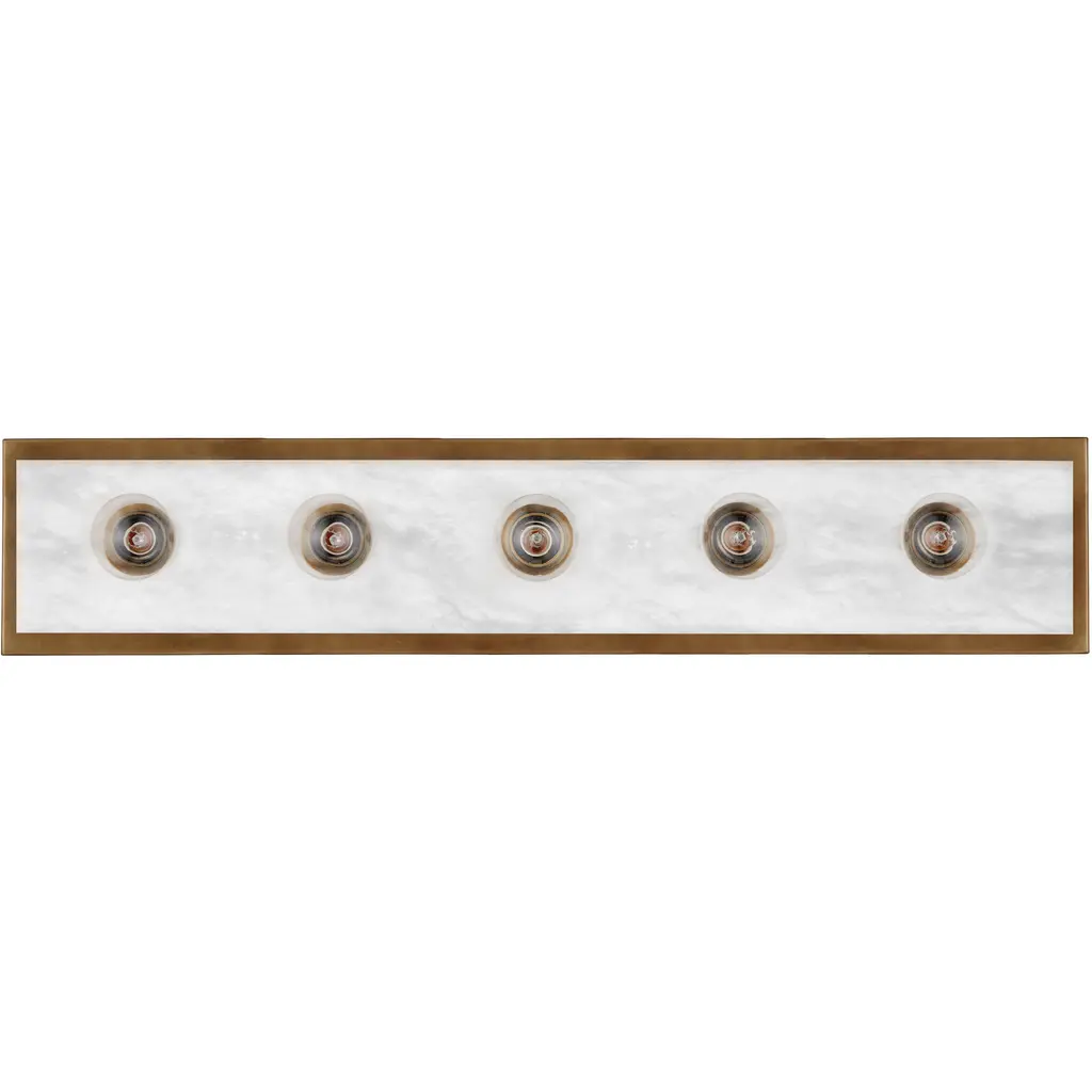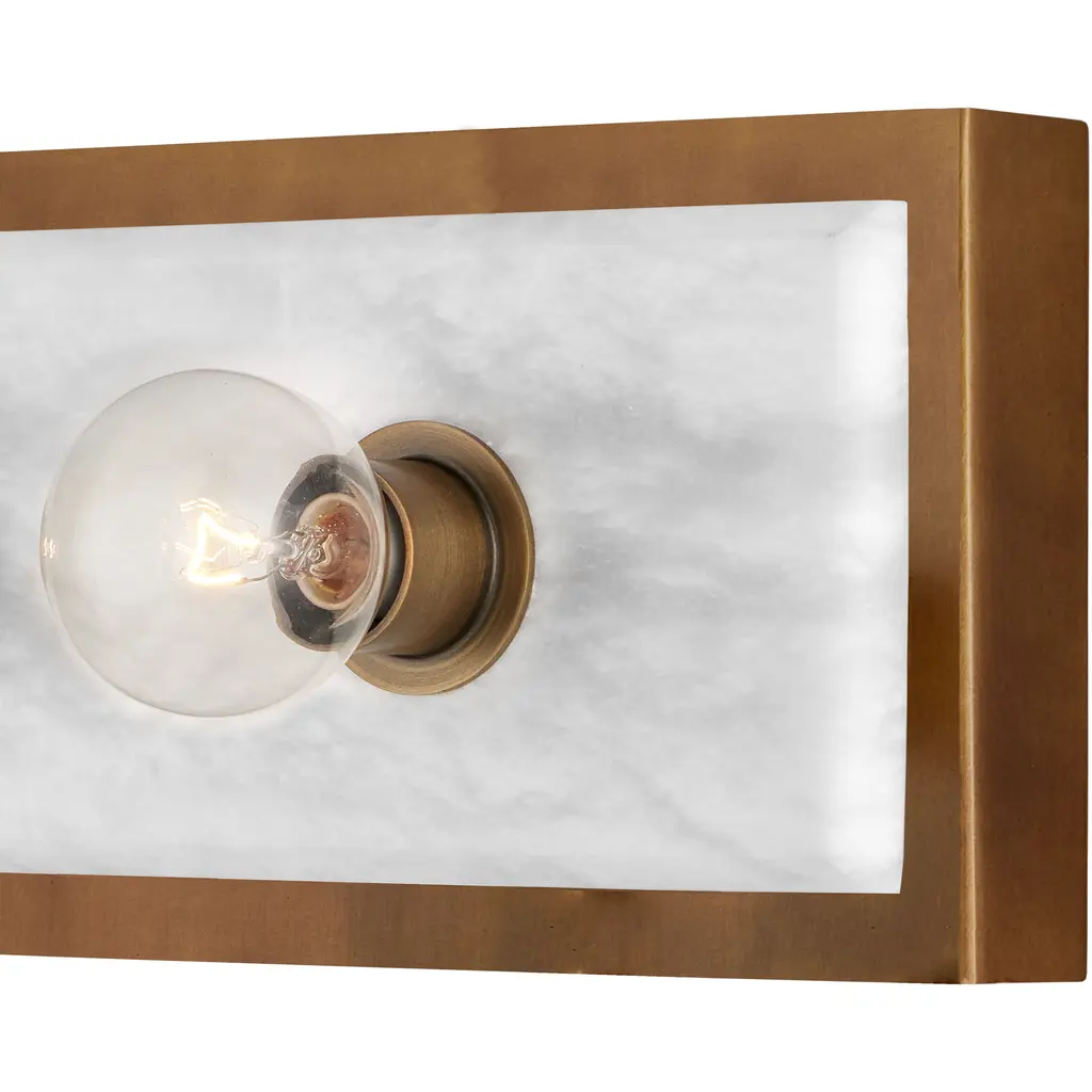 The Berdine Large Brass Bath Bar is a simple design that allows the natural alabaster to shine. Made of metal in an antique brass finish, the warmth of the gold contrasts the coolness of the stone to bring a subtle complexity to this design. It can be mounted vertically or horizontally, and the alabaster panel has a nice bevel to it where it meets the metal rim.