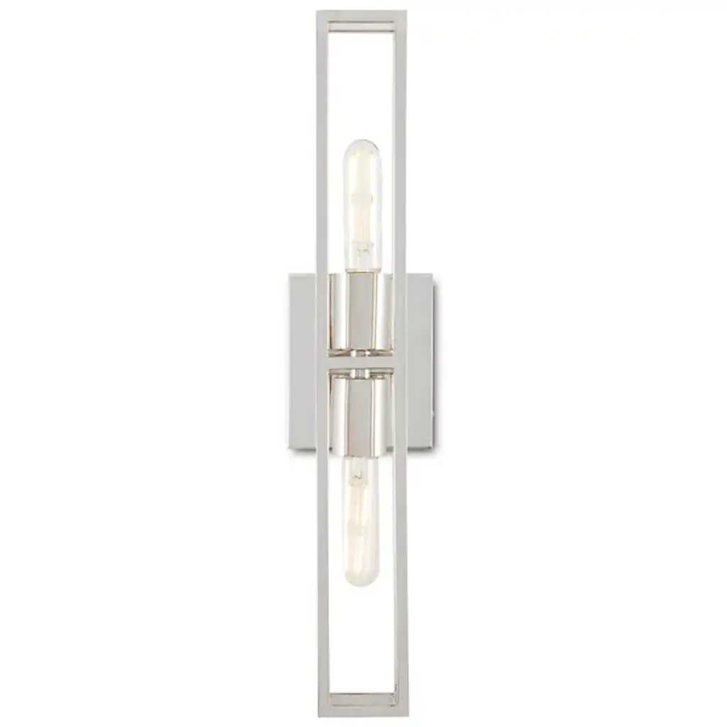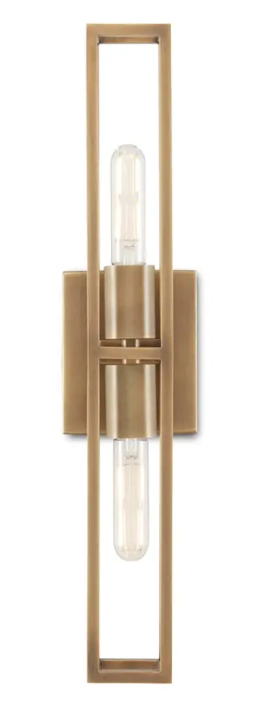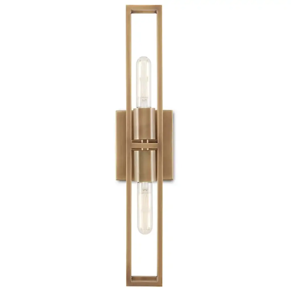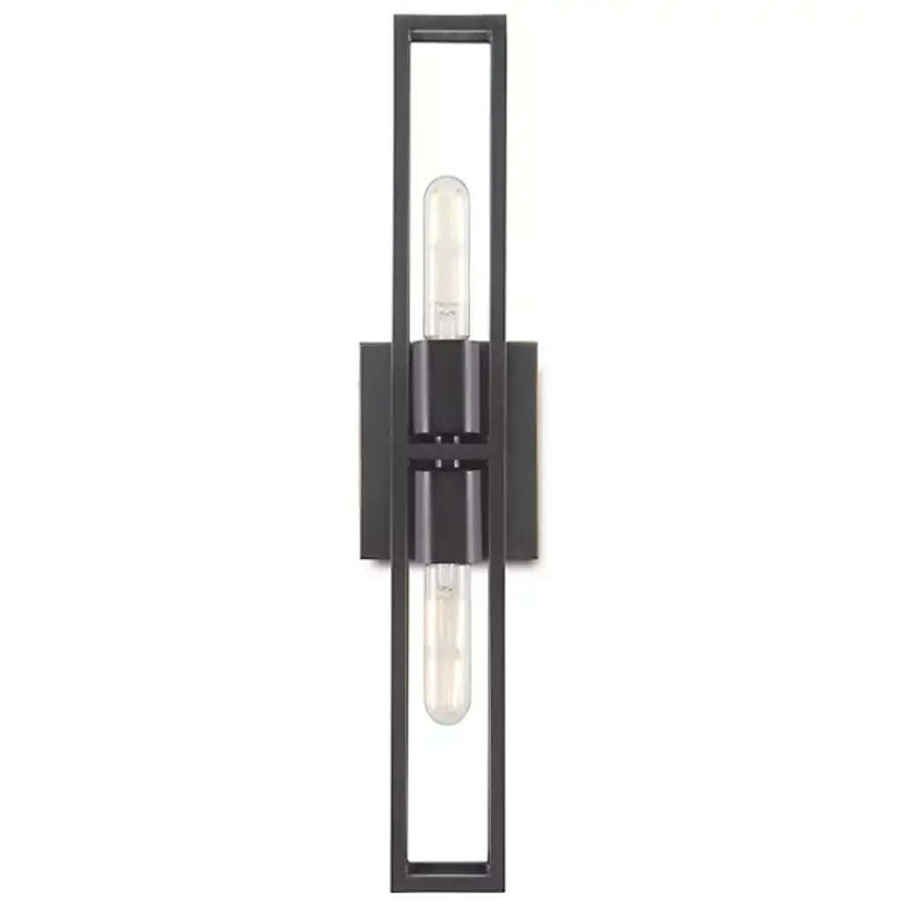 Catch the eye of guests to your home with the unique silhouette of the Bergen Wall Sconce from Currey & Company. Mounting directly to the wall, this piece features a small square backplate that upholds a lengthy and open rectangular frame. The frame includes a pair of large bulbs that face up and down, providing a bright and even glow that fully transforms the surrounding space when they come to life.