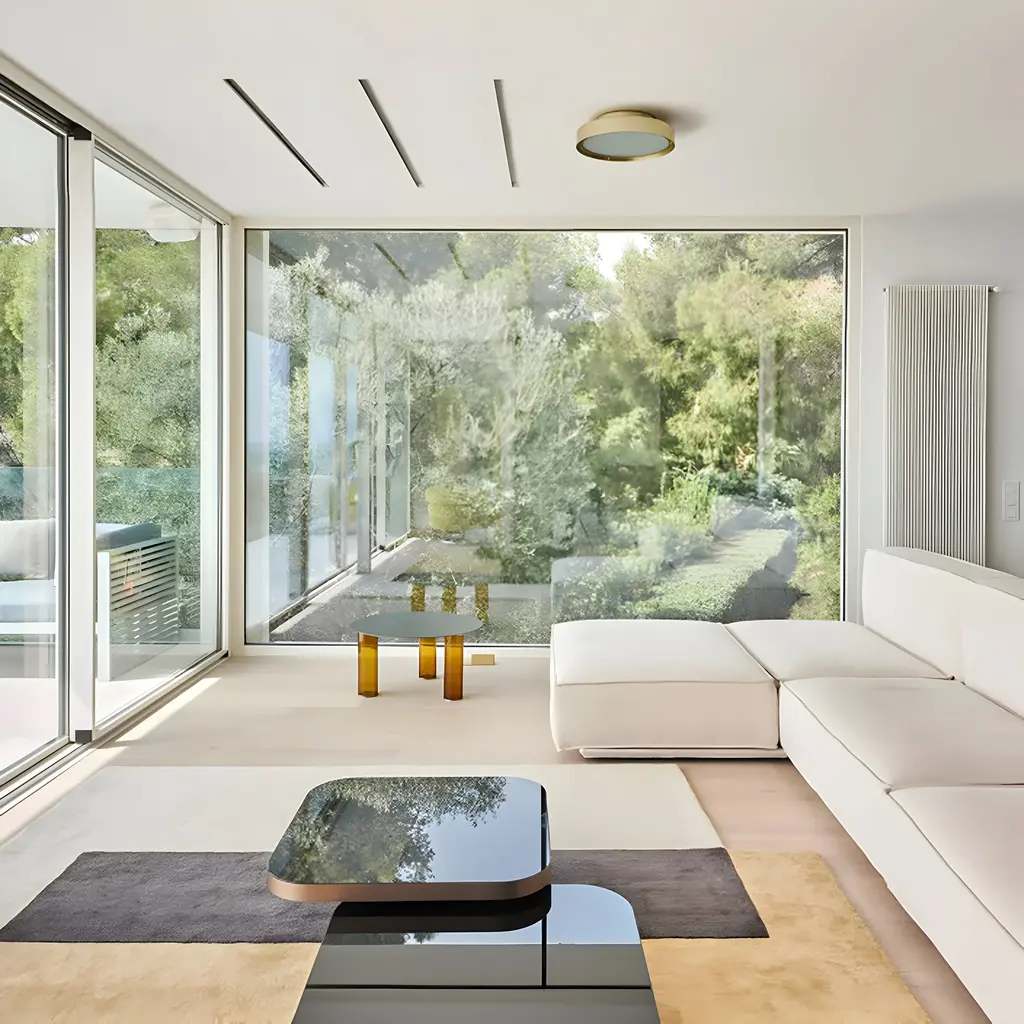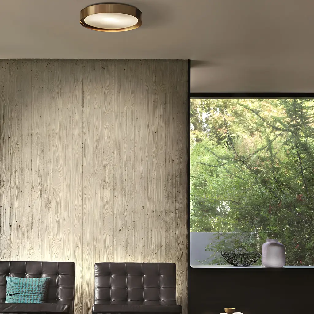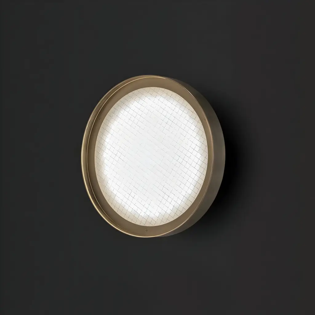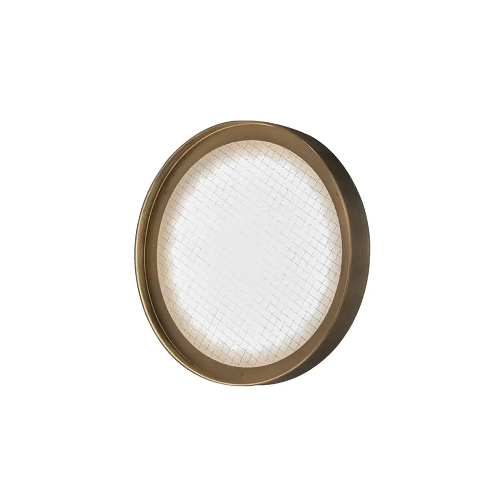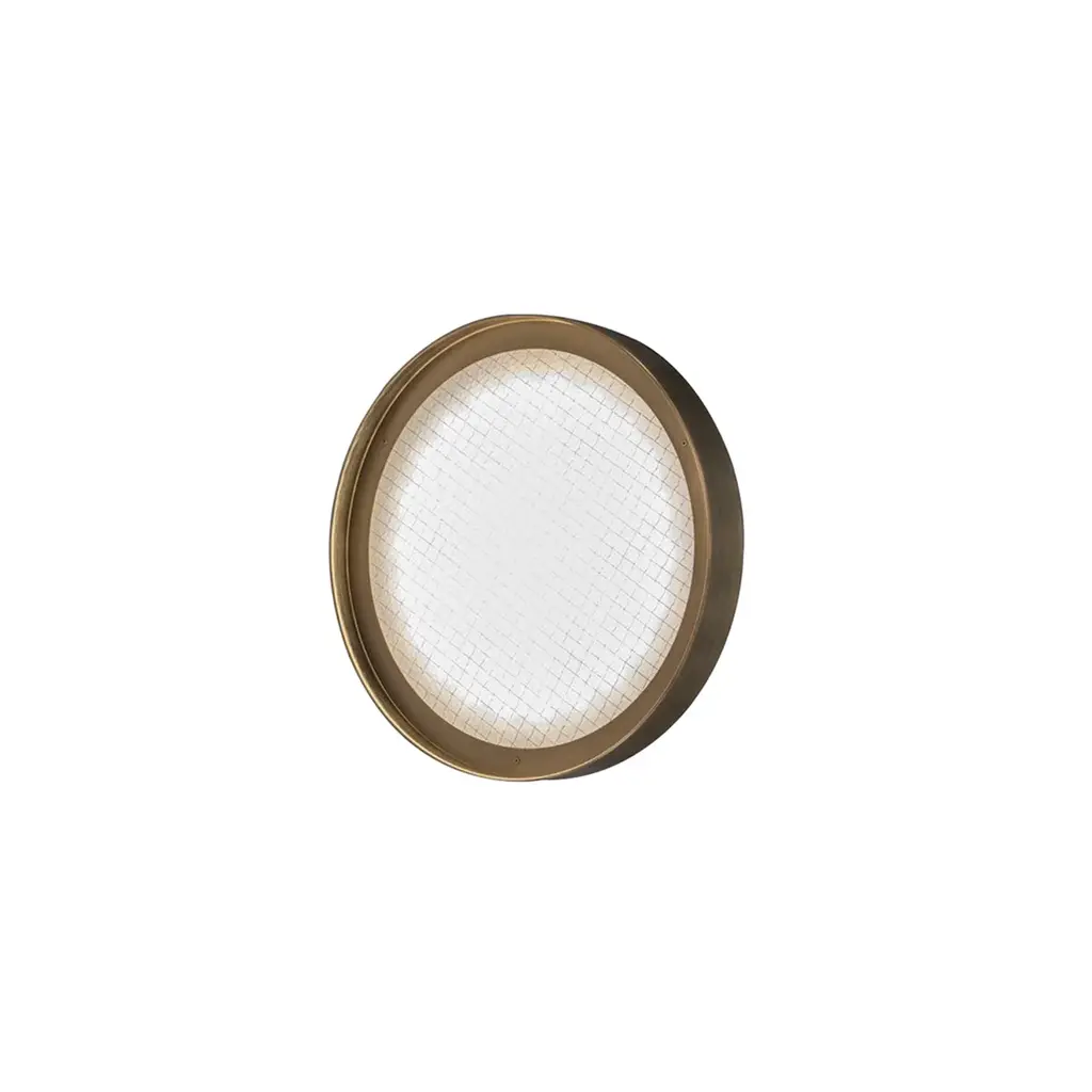 The Berlin Wall/Ceiling Lamp, designed by Christophe Pillet, features a sand-blasted wired glass diffuser combined with a sleek metal frame, making it a versatile option for both wall and ceiling installations. Available in finish anodized brass. With a low profile and compact dimensions, the Berlin lamp is ideal for spaces that need discreet but stylish lighting. Available in 3 sizes.
