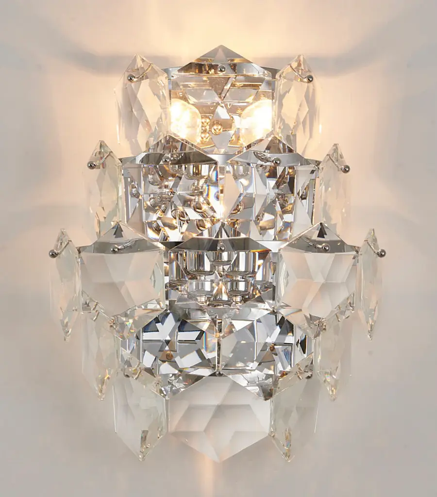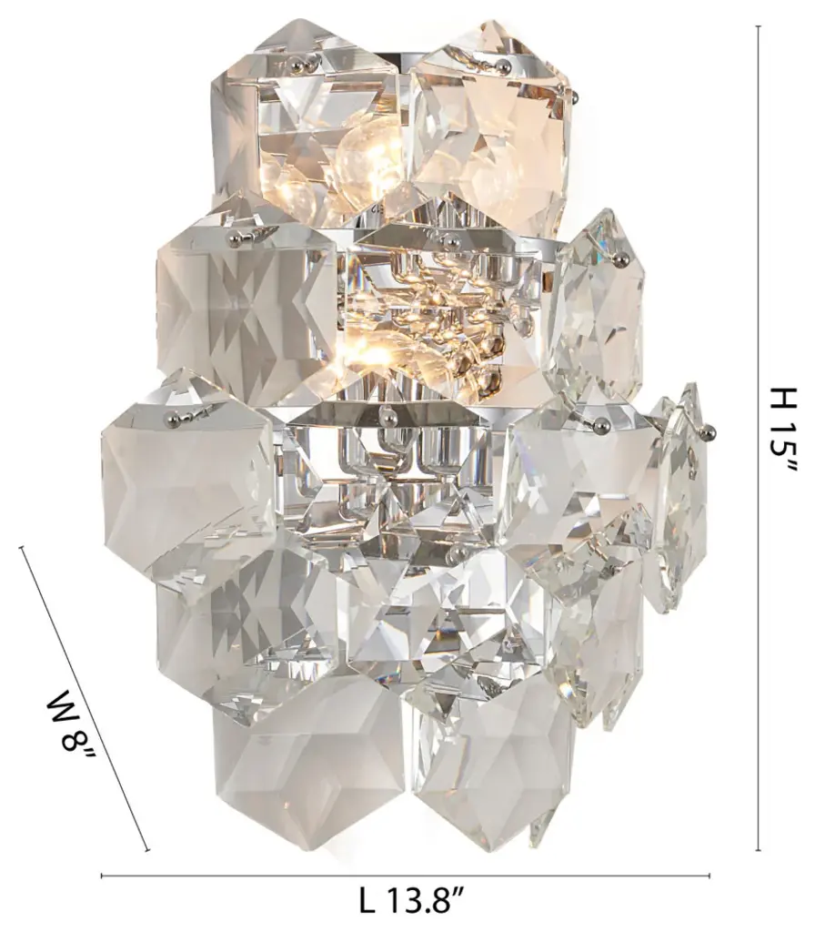 Bethel International GL434W14CH 40-Light Wall Sconce, Chorme. Finish: Chorme. Materials: Stainless Steel and Crystal. Dimension(in): 13.8(L) x 8(W) x 15(H). Bulb: (3)40W E12 Base(Not Included). Dimmable: N. Crystal Component: Y. Swag Light: N. Sloped Ceiling Compatible: N. Integrated LED: N. Voltage: 120. Power Source: Junction Box. Assembly Required: Yes. Certifications: UL Listed.