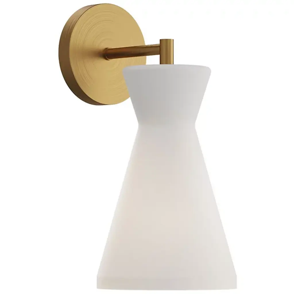 Enhance interior walls with the striking, sculptural character of the Betty Wall Sconce from Alora Mood. An inspired retro-modern design that contrasts a streamlined steel suspension structure emerging from a small disc wall plate with a matte-textured glass shade that flares out around the lamping, it adds a tasteful vintage presence to its surroundings. The glass transforms direct glare into a mix of focused downlight and reflected warmth, expressed as a layered wall wash through the shade’s open base.