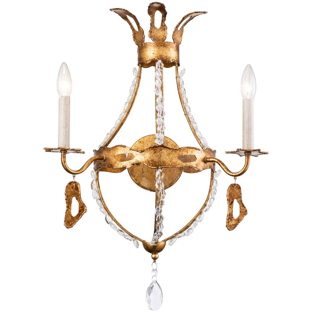 Sconce in a gold leaf finish with matching candlesticks, featuring beveled crystal accents.