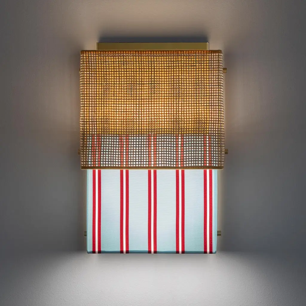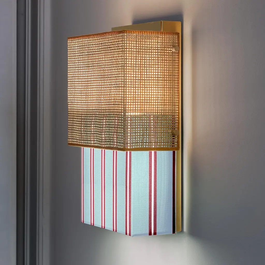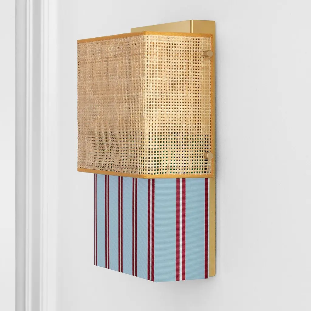 This elegant, whimsical wall lamp is made from a surprising combination of contrasting textures and textiles. A rough rattan surface sits above smooth Trevira fabric in light-blue, red and white stripes. This two-piece design was inspired by the iconic bikini swimsuit. A lustrous, gold-plated structure diffuses and reflects the light.
