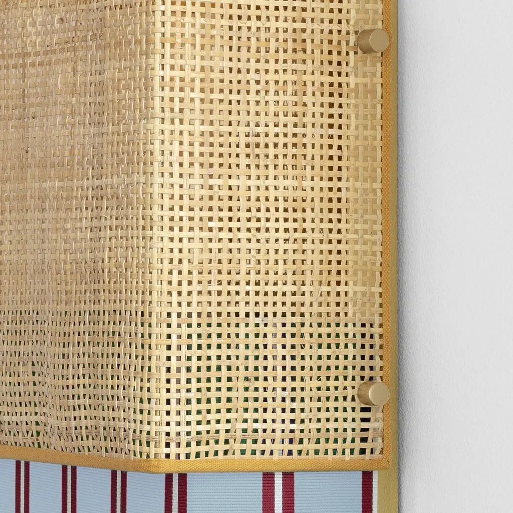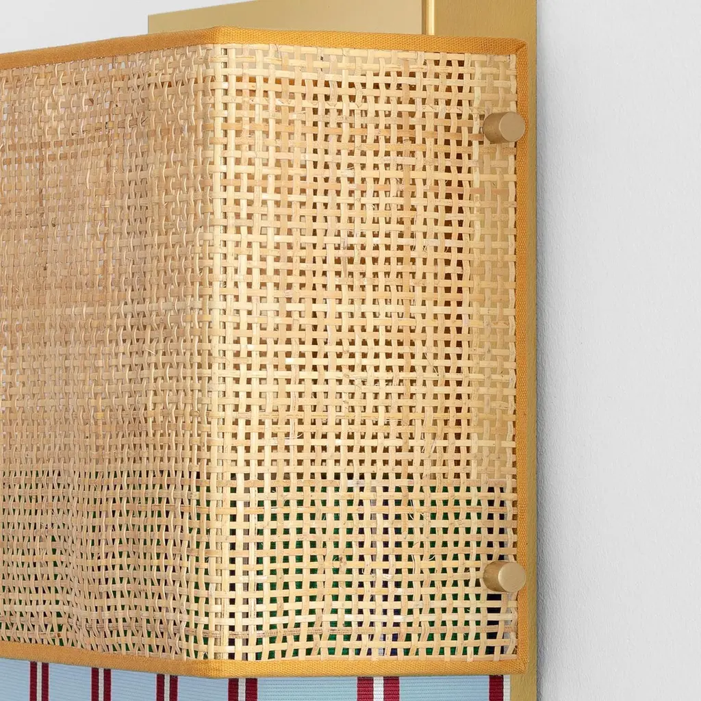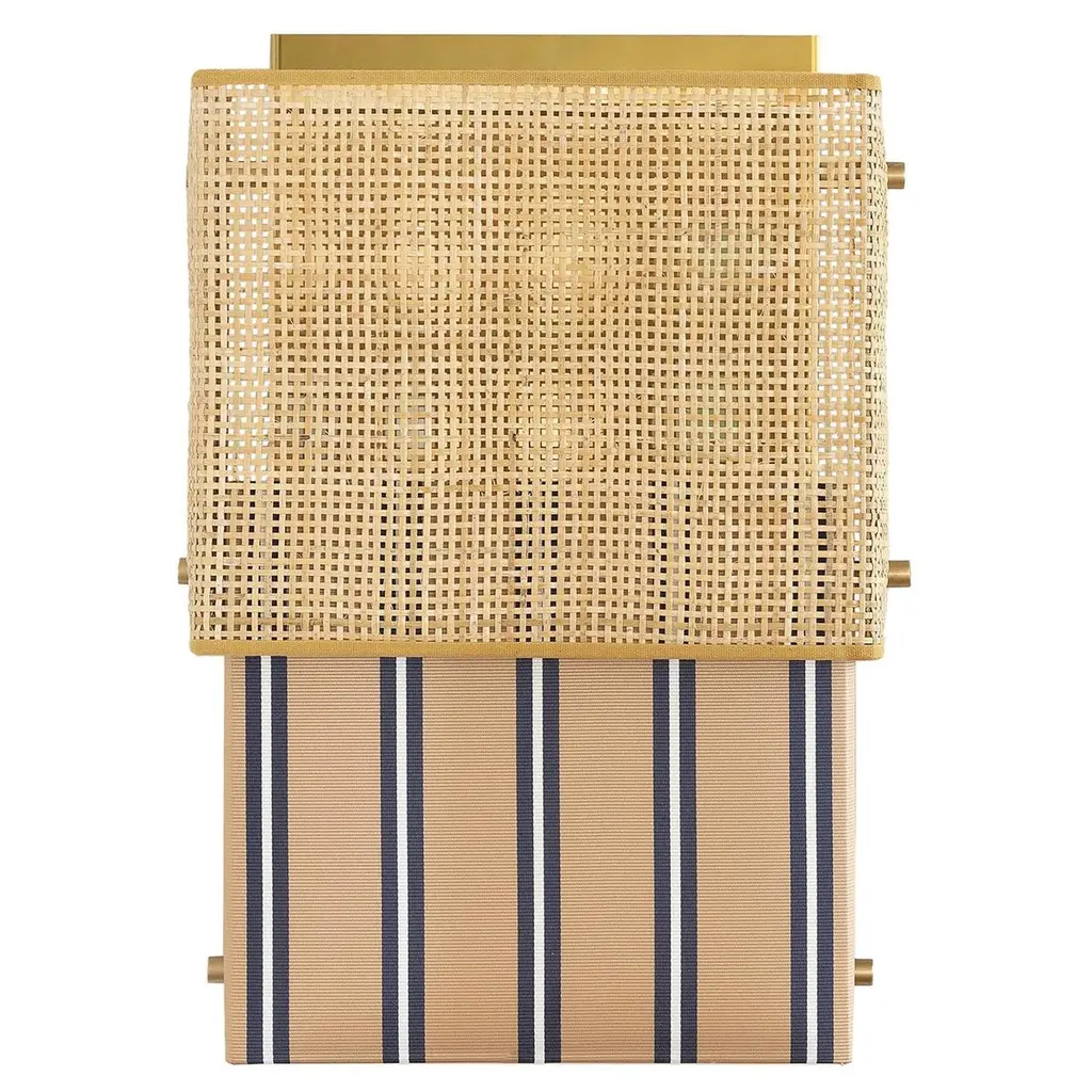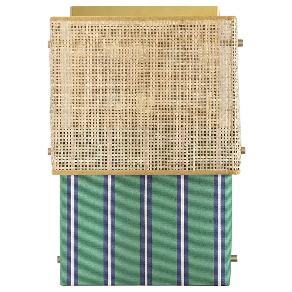 This elegant, whimsical wall lamp is made from a surprising combination of contrasting textures and textiles. A rough rattan surface sits above smooth Trevira fabric in light-blue, red and white stripes. This two-piece design was inspired by the iconic bikini swimsuit. A lustrous, gold-plated structure diffuses and reflects the light.