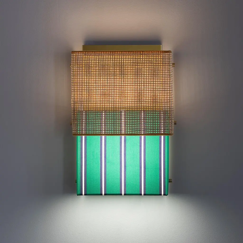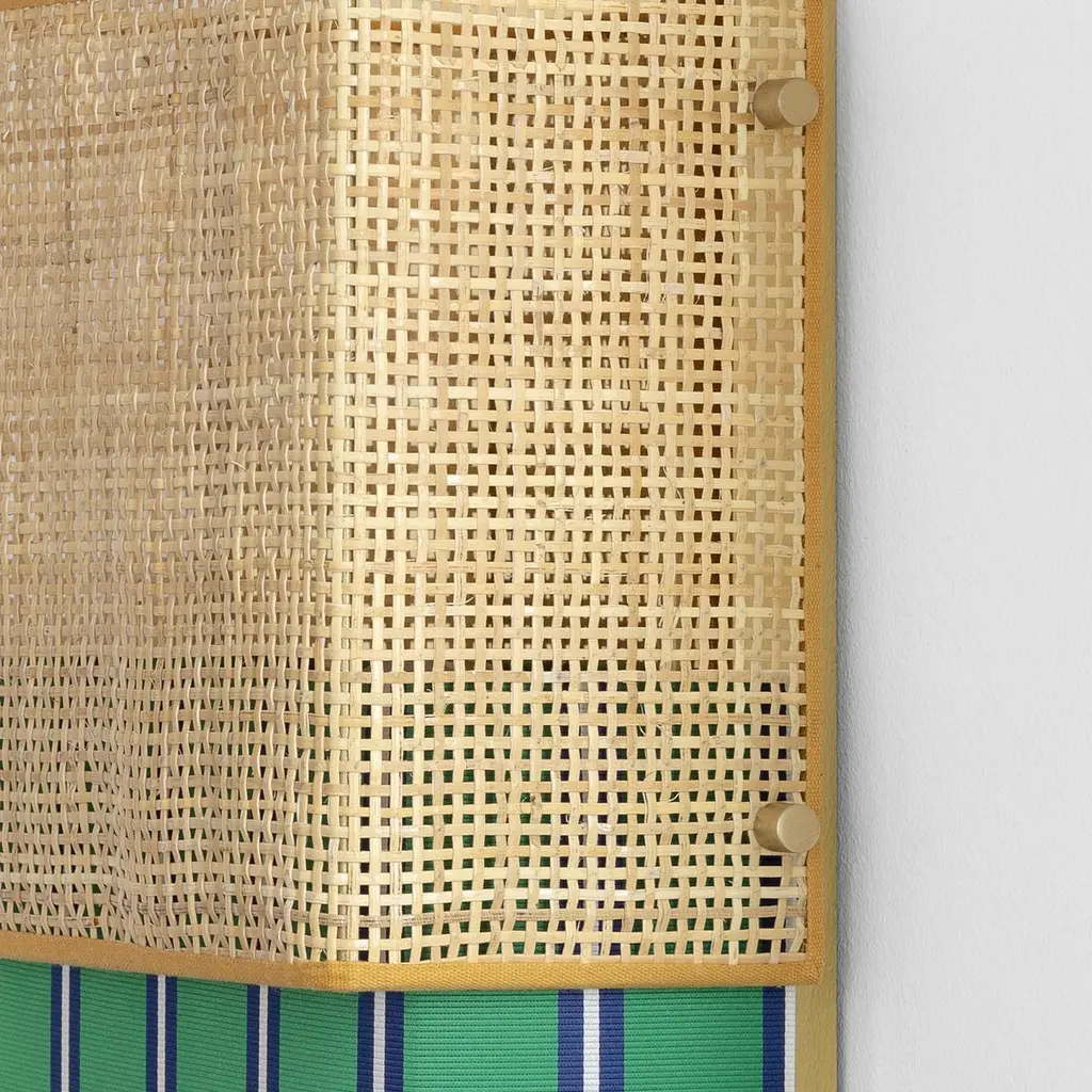 This wall lamp was inspired by the legendary female swimsuit. Just like the Bikini, this mounted item is composed of two pieces, one in rattan and the other in striped Trevira from the Italian fabric manufacturer, Dedar. Its reflective gold-plated, stainless-steel structure has a lustrous surface that diffuses the light.