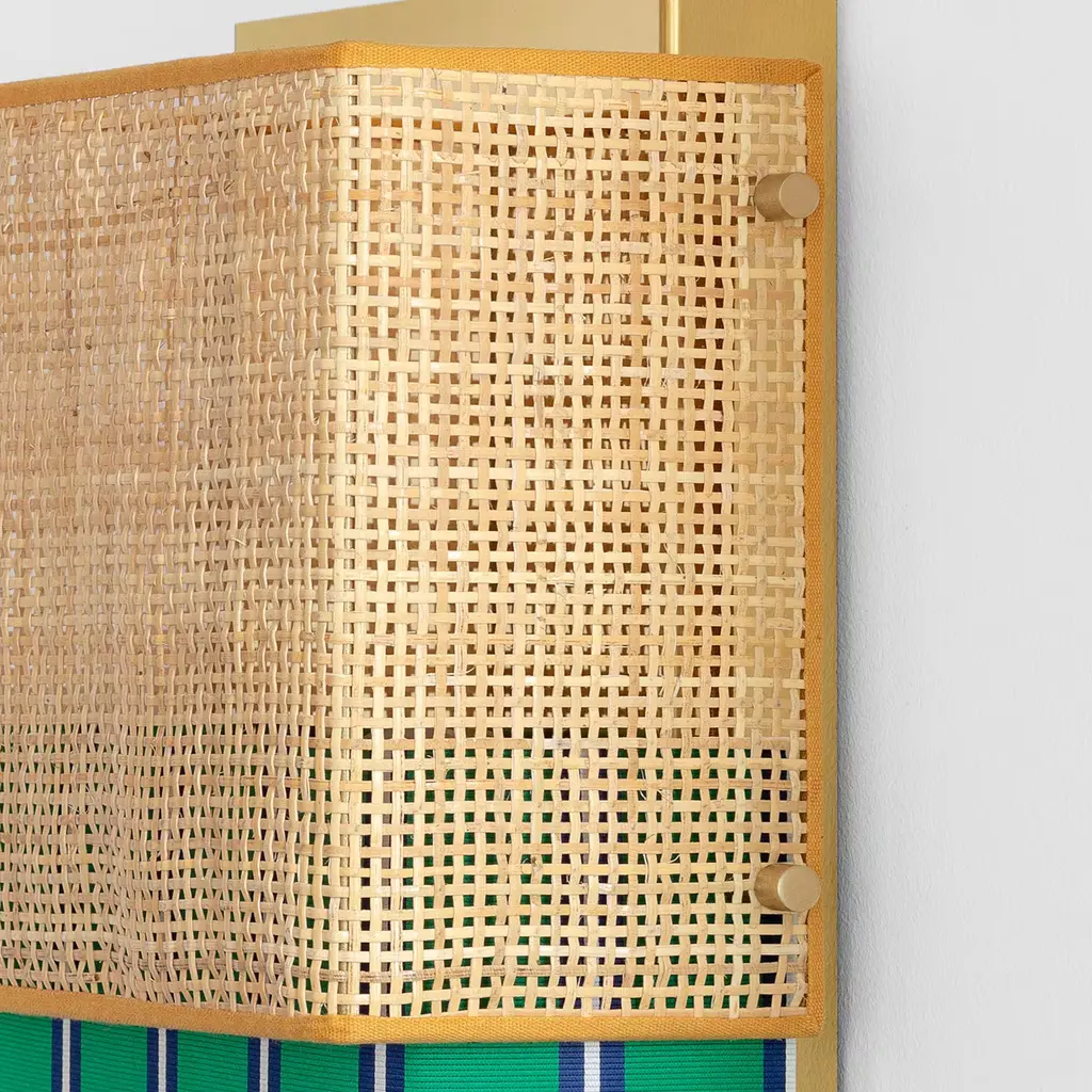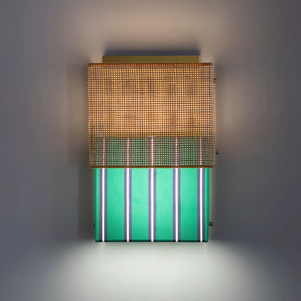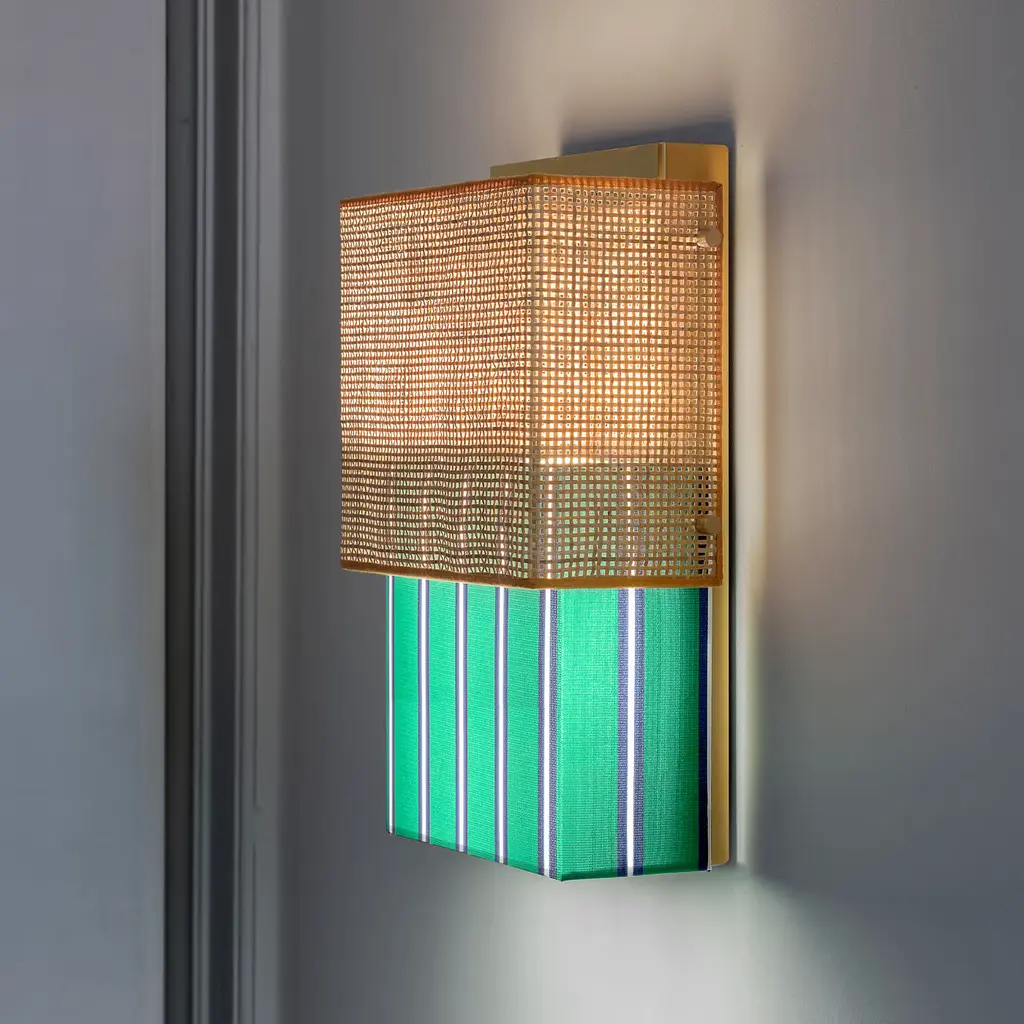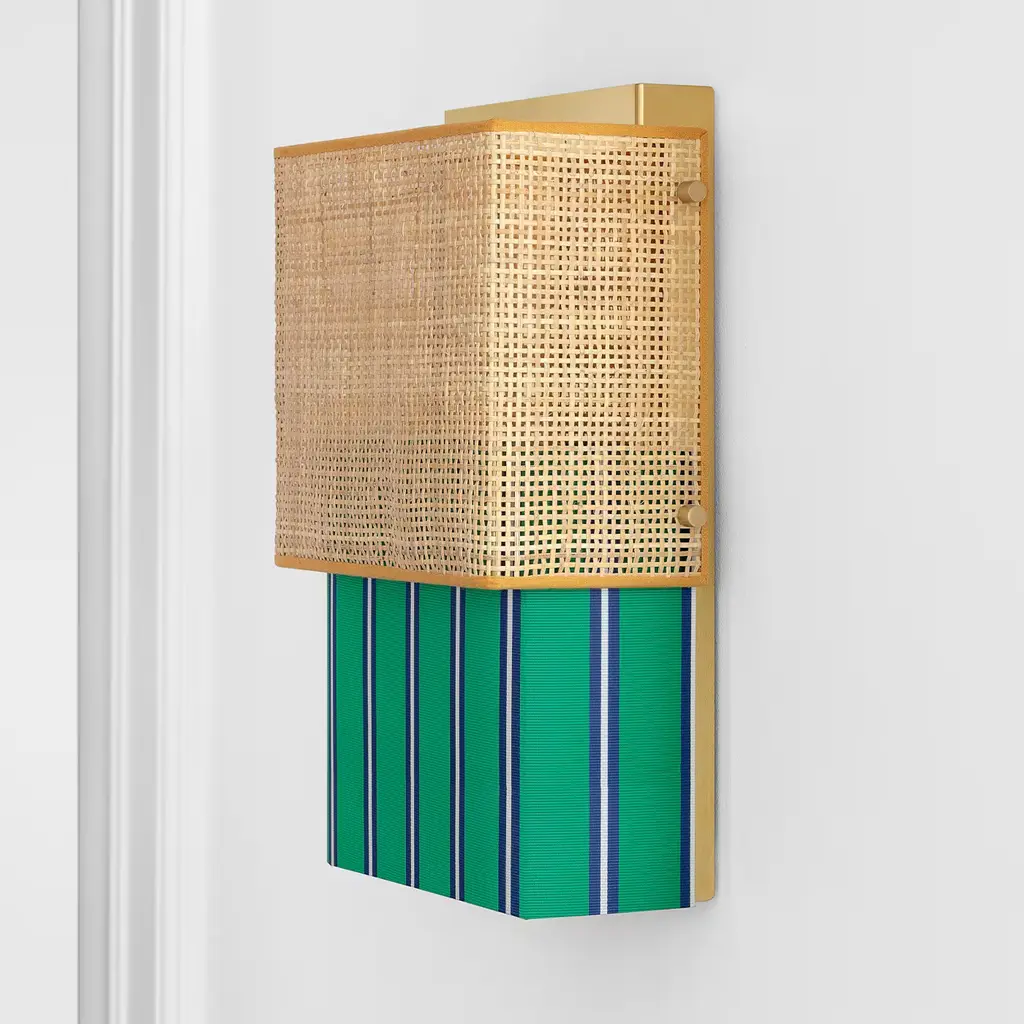 This wall lamp was inspired by the legendary female swimsuit. Just like the Bikini, this mounted item is composed of two pieces, one in rattan and the other in striped Trevira from the Italian fabric manufacturer, Dedar. Its reflective gold-plated, stainless-steel structure has a lustrous surface that diffuses the light.