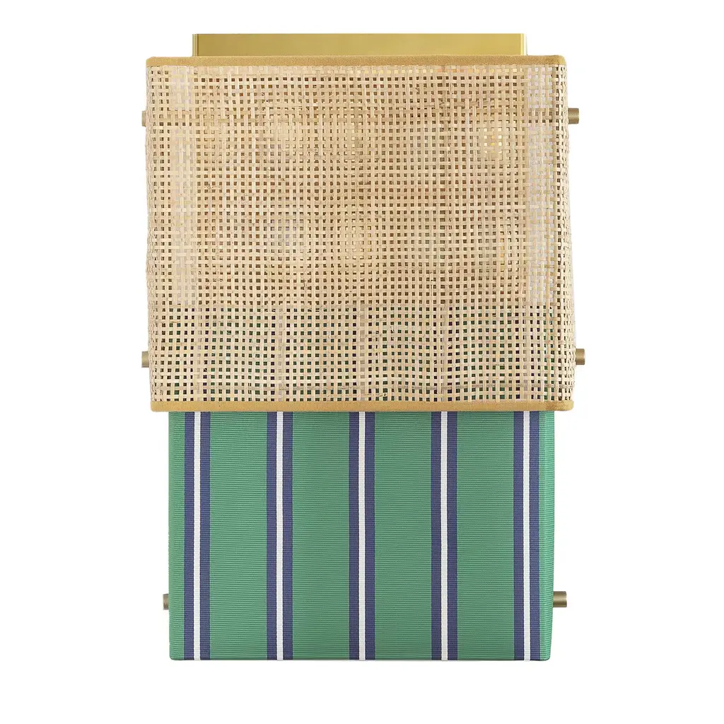 Wall lamp inspired by the legendary female swimsuit. Just like the Bikini, this applique is composed of two elements, one in rattan and one in Trevira striped fabric by Dedar. The reflective golden stainless steel structure, to which the lampshade elements are attached, functions as a mirror and diffuses the light.
