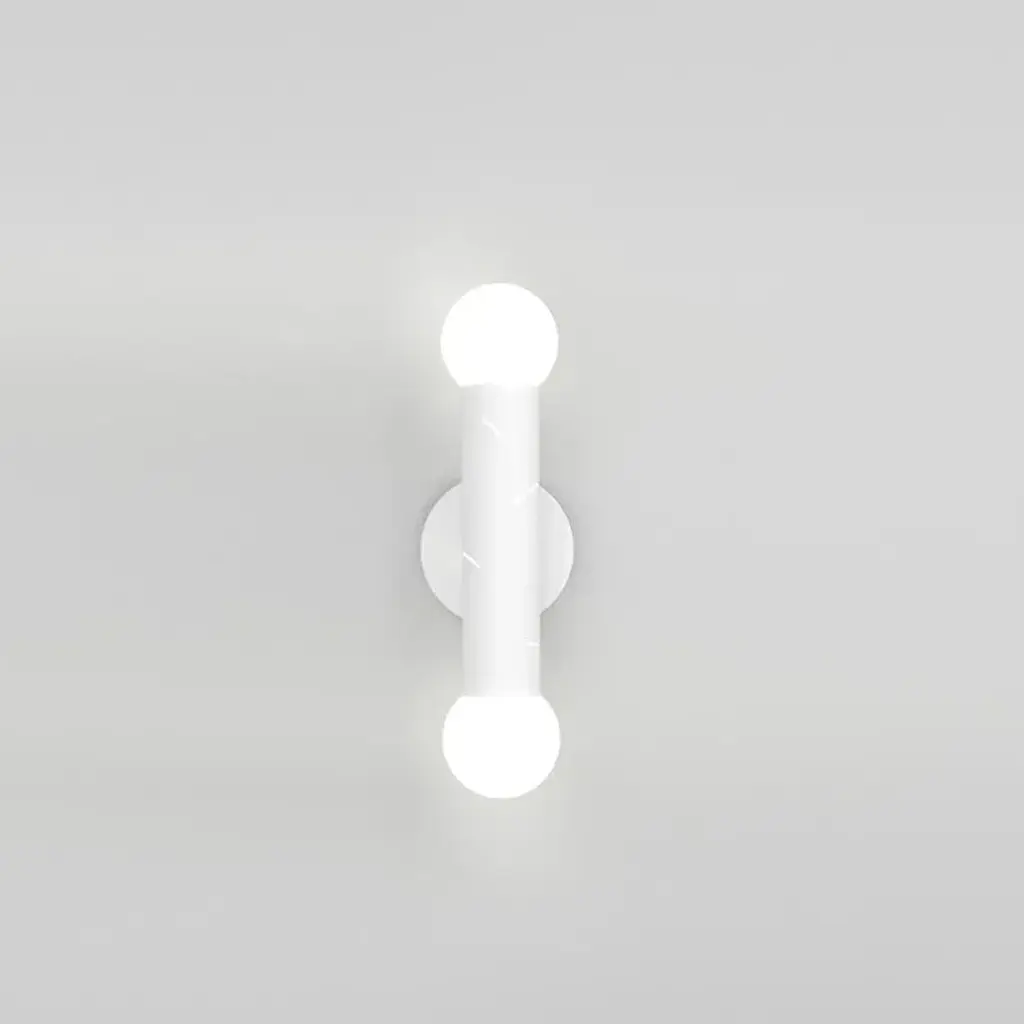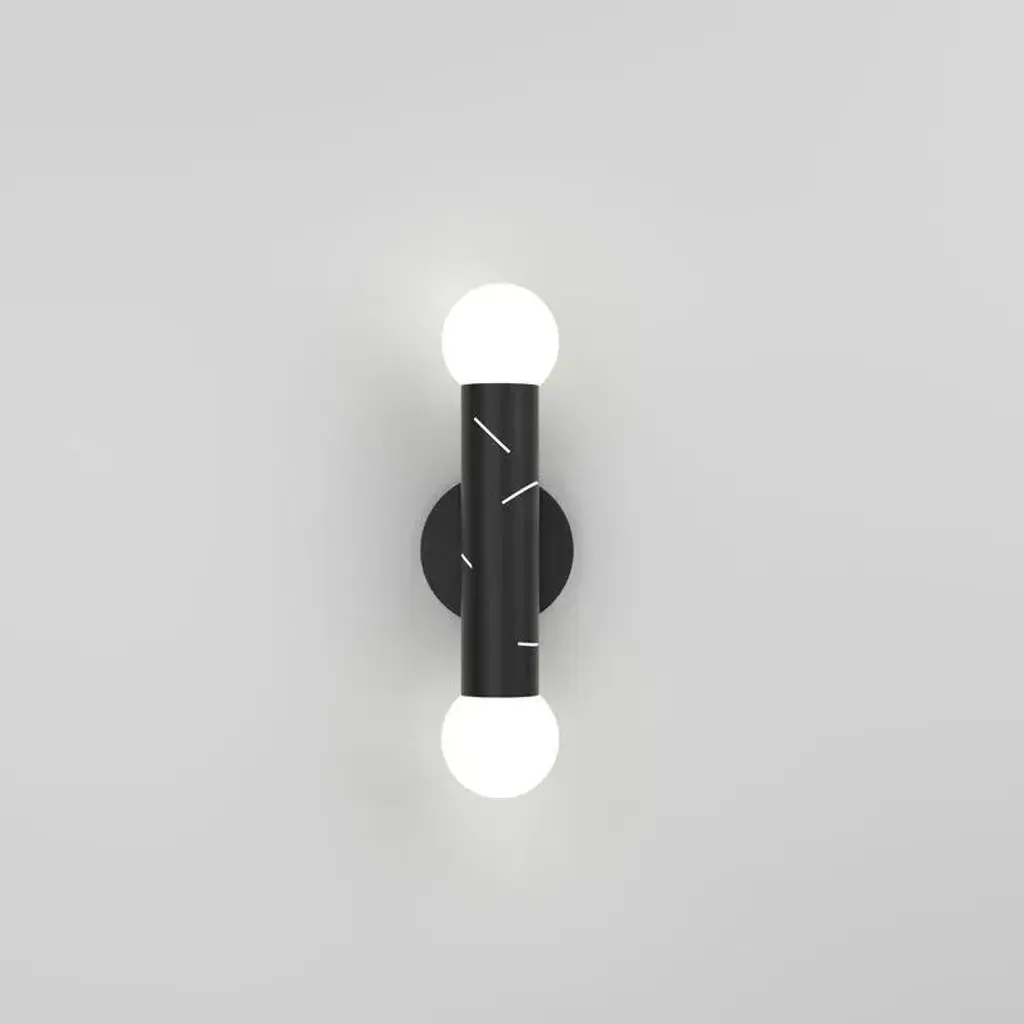 Birch wall light, 2 globes, by atelier areti dimensions: d 9 x w 12 x h 40.5 cm. Materials: black powder-coated metal, white glass. up to 250v (europe/uk standard).