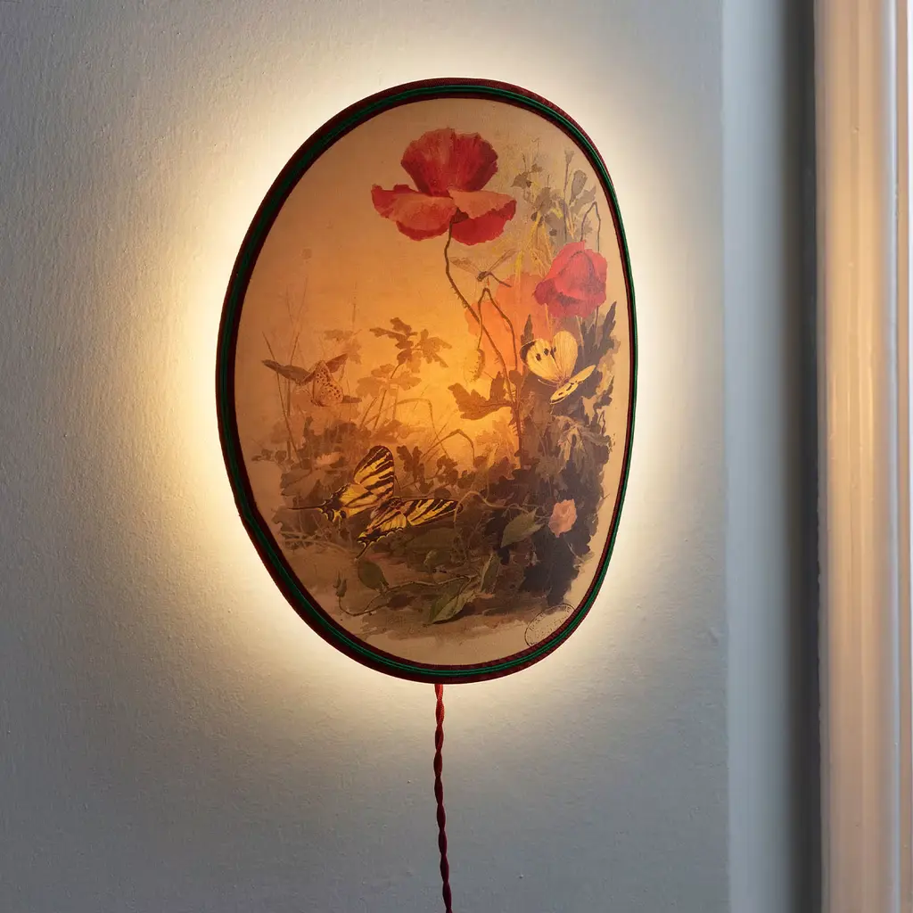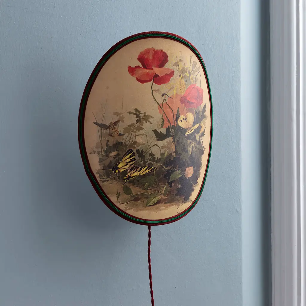 Our Birds & Butterflies collection reproduces a 1750s vintage illustration from the SERVOMUTO archives, featuring fourteen different wild birds and butterflies. The lampshade is made from printed paper. It includes 1 x E27 or E26 bulb (not included) and a 2-meter bordeaux silk-like braided cable. It has a switch on the cable, and it is not dimmable.