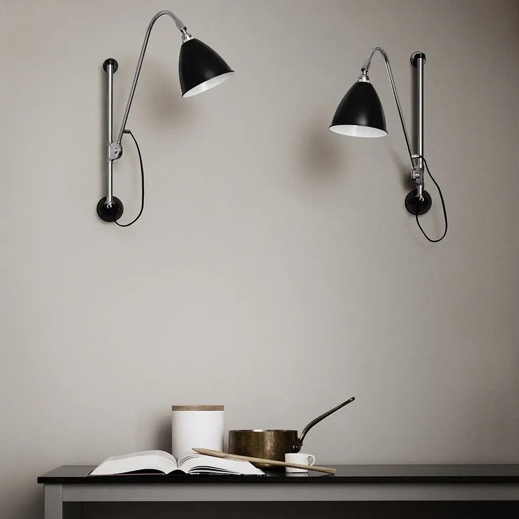 Designed by the British designer Robert Dudley Best in 1930, the Bestlite BL5 Wall Lamp exudes simplicity and clean shapes in line with the school from Bauhaus, which the designer was highly influenced by. With its adjustable arm, both horizontal and vertical, and movable shade, the Bestlite BL5 Wall Lamp suits well by the desk, as a bedside lamp or in the kitchen where the light needs to be directed. BL5 Wall Lamp is available in two different versions: Hardwired & Wired. Hardwired indicates that the wall sconce is mounted directly to the electrical output. Wired is when the wall sconce has a cord and plug. On the hardwired version, the switch is located on the back plate. On the wired version, the switch is located on the cord. The height is adjustable and the lamp can be tilted 90 degrees from horizontal to vertical. The shade can also be rotated 360 degrees. The textile cord matches the shade on wired models.