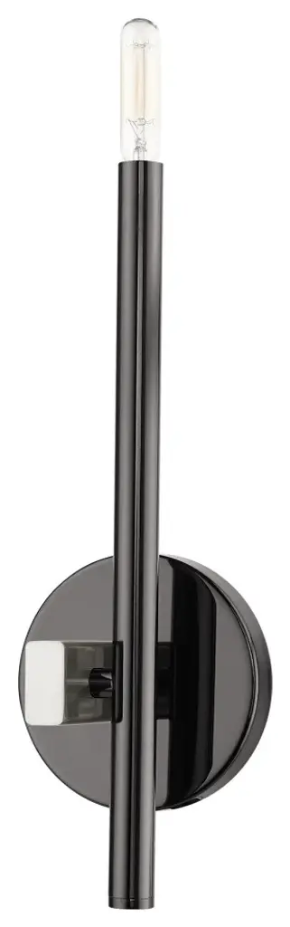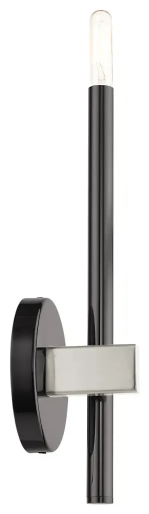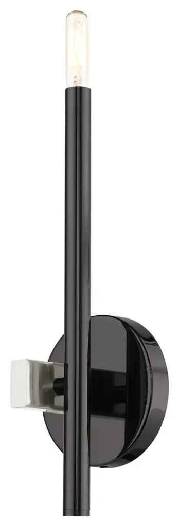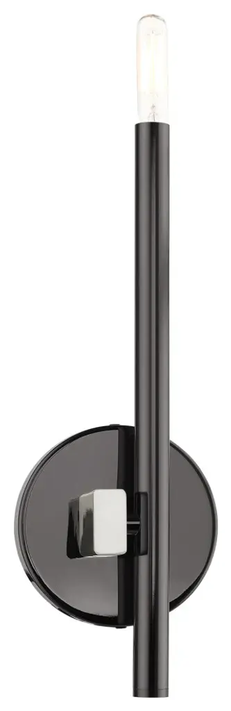The clean lines of the Denmark collection remind of early modern Scandinavian style. The slim candles rise on the contrasting bar at different heights dynamically emulating the shape of a city skyline. This single-light exposed bulb sconce comes in a black chrome finish with brushed nickel finish bars. Versatile enough for almost any interior where dramatic statement is needed such as a bathroom, hallway, dining room, living room or bedroom.Bulb Type: Candelabra BaseNumber of Bulbs: 1Bulbs Included?: NoUL Listed: ETLBulb Wattage: 60Hardwire or Plug: Hardwire
