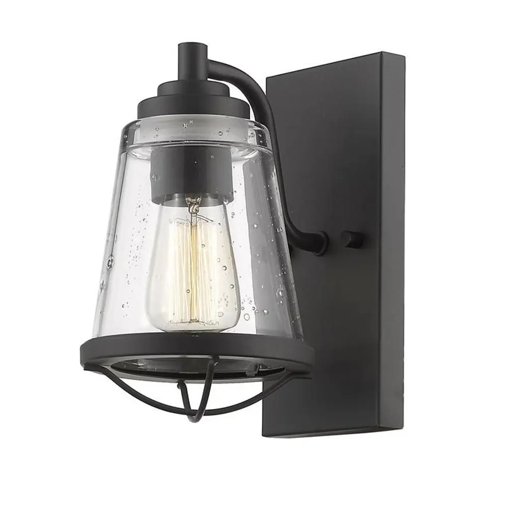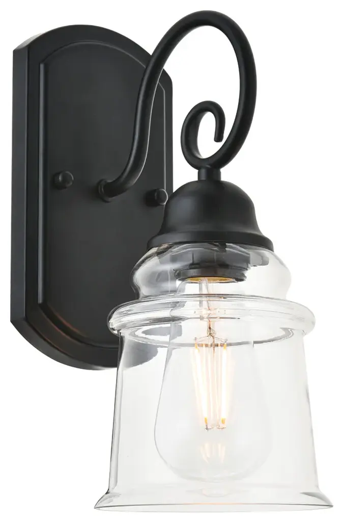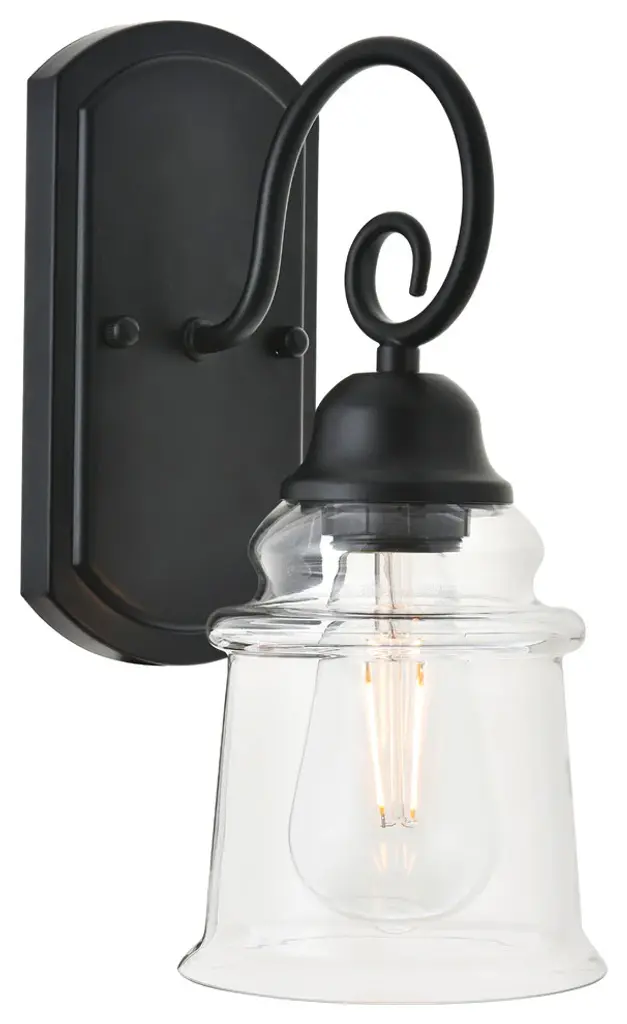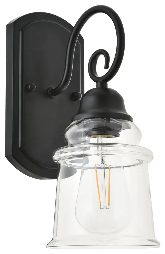 As if taking inspiration from a guide post, this whimsical black finish wall sconce will guide you well from out of the darkness. The slender arm spirals inwards at the top, with the light within a clear glass shade shining dutifully. However, despite its playful design, a sense of refinement and luxury is seen and felt. Perfect for any room--whether it''s in the foyer or bathroom.Black finish wall sconce with a spiral arm and a suspended lightRequires 1 E26 bulbs (bulbs not included)Shapely bell-like clear glass shadeWall sconce back plate finish: blackBack plate length: 8.3"; width: 4.3"; height: 0.8"Wall sconce extension: 7"assembly required: yes