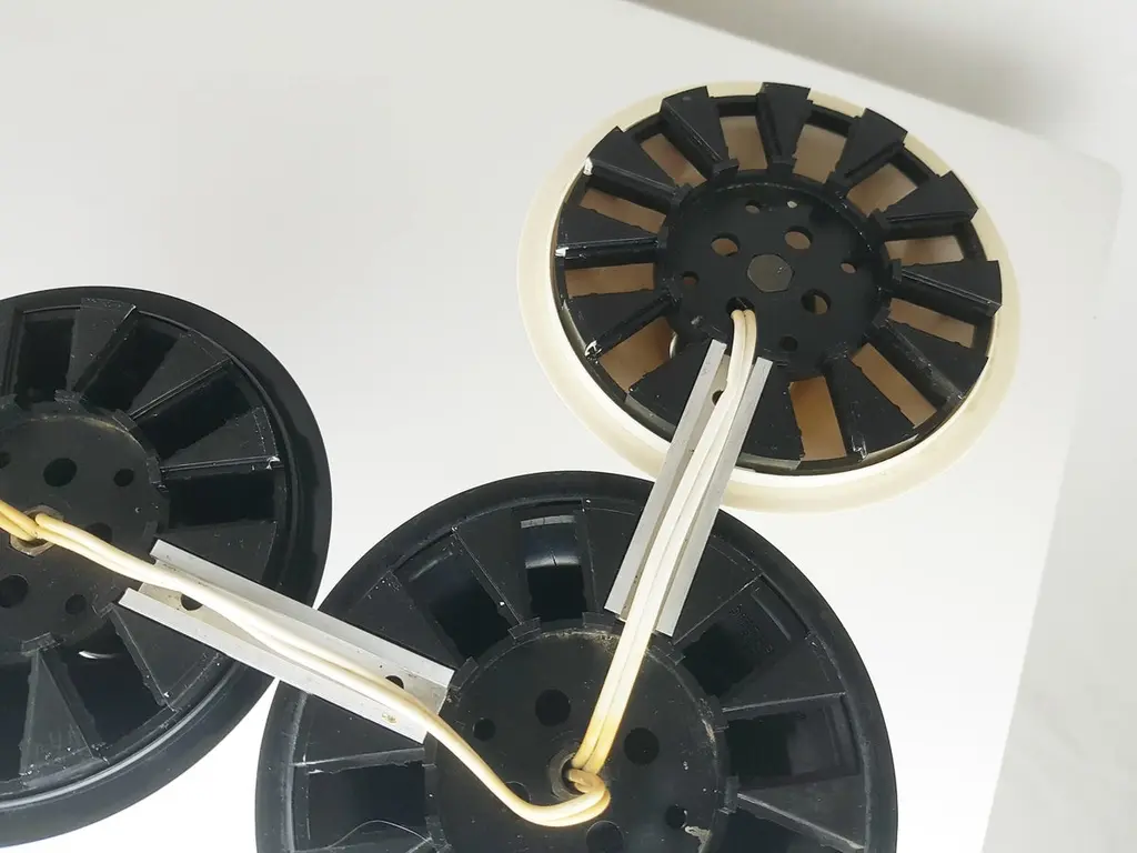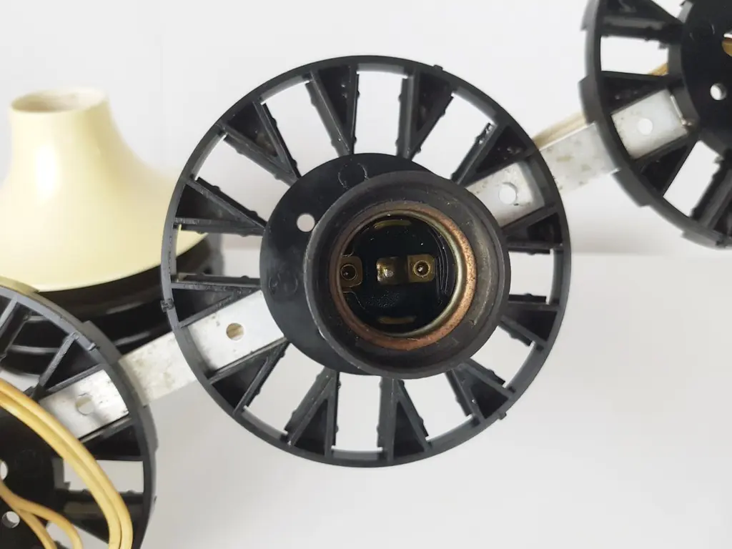 This lamp is composed by 4 single Teti lamps, joined together by an aluminum structure. It can be used as a ceiling lamp, wall lamp or mirror lamp as well. it remains in good condition: the 4 plastic shades have been polished. The plastic and aluminum structure (not visible once mounted) shows visible oxidation.Available n°2 of this 4-light lamp.