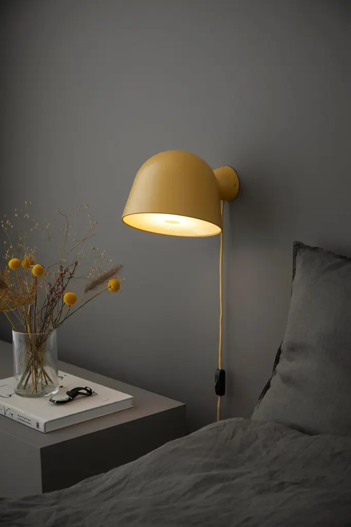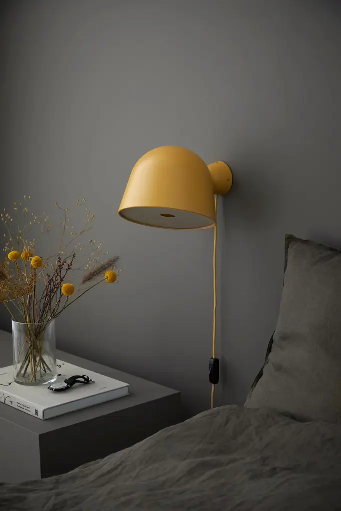 Black Kuppi wall lamp by Mika Tolvanen.Materials: metal.Dimensions: D 24 x H 16.5 cm.Available in black or mustard yellow.Mika Tolvanen is a renowned Finnish designer. After graduating from The Royal Collegeof Art, London, he established his own studio. Today he runs Studio Tolvanen together with his spouse, Julie Tolvanen, creating playful and characteristic designs with an aim to make new designs more exciting. He believes that good designs stem from comprehension of materials and a desire to improve how they work.WOUDThe founders, Mia and Torben Koed, decided to put their 30 years of experience into a new project. It was time for a change and a new challenge. The challenge was to build an ambitious design brand from the ground up with high-quality materials and great attention to the little details. With a drive to create new originals, the WOUD collection is founded upon the idea to look ahead instead of looking back and share the love for honest design. Therefore, we are eager to discover and develop new ideas whether it being in form, function or choice of material. All our lamps can be wired according to each country. If sold to the USA it will be wired for the USA for instance.