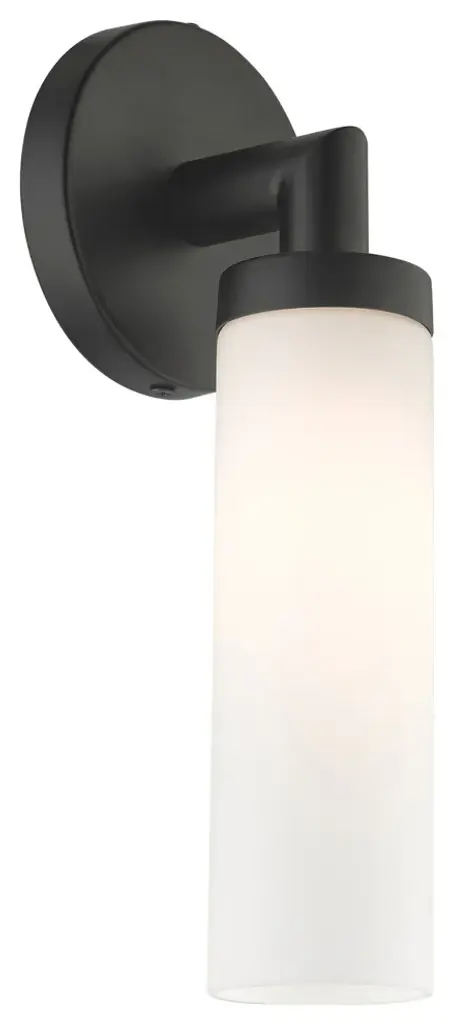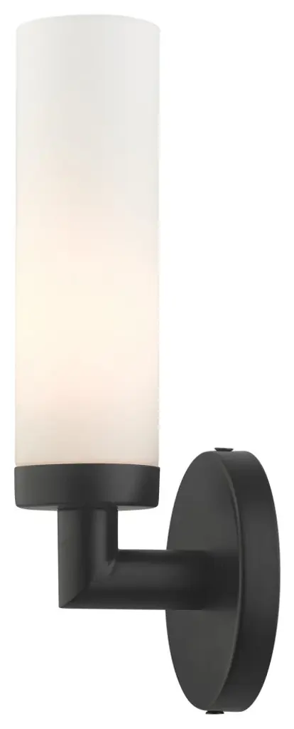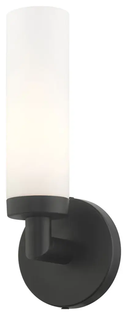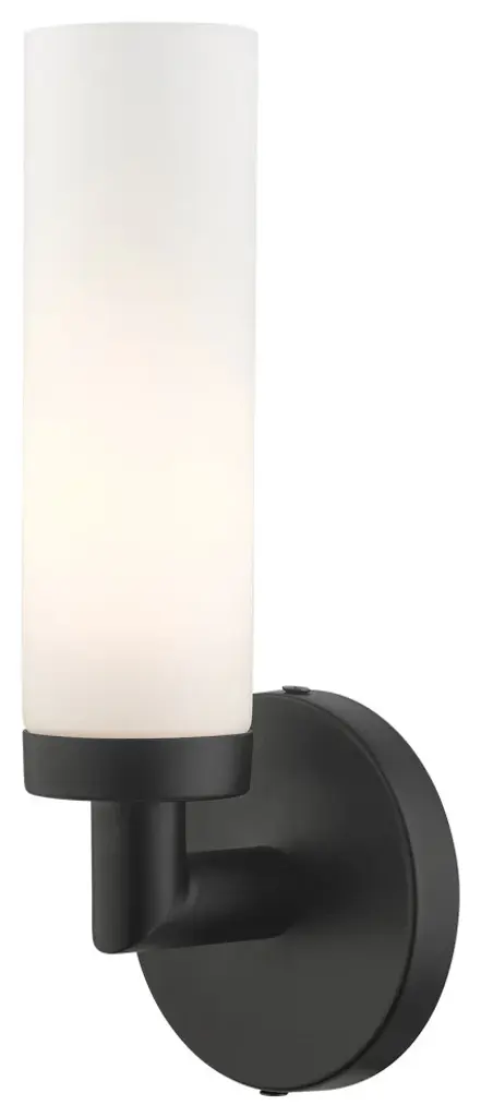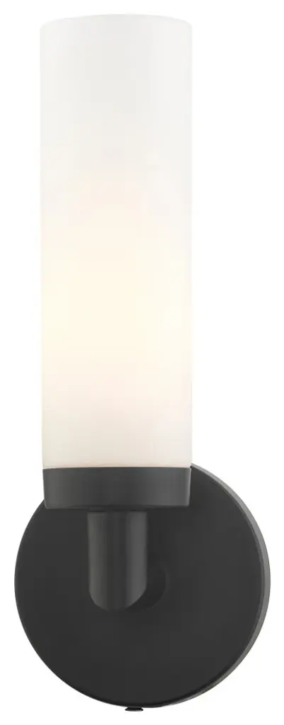 Add a dash of character and radiance to your home with this wall sconce. This single-light fixture from the Aero Collection features a black finish with a satin opal white glass. The clean lines of the back plate complement the cylindrical glass shade creating a minimal, sleek, urban look that works well in most decors. This fixture adds upscale charm and contemporary aesthetics to your home. Bulb Type: Candelabra BaseNumber of Bulbs: 1Bulbs Included?: NoUL Listed: ETLBulb Wattage: 60Hardwire or Plug: Hardwire