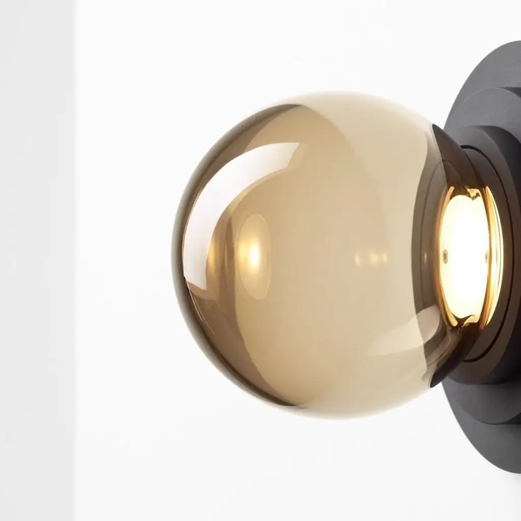 Black Stratos mini ball wall light by Dechem StudioDimensions: D 12 x H 14 cmMaterials: Aluminum, glass.Also available: Different colours availableDifferent shapes of capsules and spheres contrast with anodized alloy fixtures, creating a surprising architectural element. The luminaires are available in various colours including crystal clear, smoke grey, alabaster white, pink, green and orange.Glass, just like people or trees, is perfectly capable of being shaped and formed. One can imprint just about anything into it, give it a form, capture a passing moment, breath a new life into it. Later it stiffens and freezes like a petrified fossil, like magma, like a witness. No one can move it. It is solid as a rock and if you urge it, it rather shatters into pieces than to surrender.We are DECHEM.We are Michaela and Jakub, designers and storytellers in Bohemian glass. Our work is based on contemporary design combined with a mastery of production and a healthy respect for old Central European craft and traditions.We design, produce and sell our collections of lights and decorative glass products. We produce unique light fixtures made from a combination of mouth-blown glass and handcrafted brass. Our glamorous chandeliers light up any space with a playful yet elegant appearance.A significant component of our work is blowing glass into a colour gradient. The wide range of fresh gradient colours is a distinctive feature of the Bandaska vase from our collection. It draws inspiration from traditional milk containers, well-known in Czech village households, and their elegant lines are now coming into modern homes in the form of our glass vases and lights.In addition to our normal production, we love to devise bespoke luminous objects for interiors. They arise from experimenting with unconventional materials and unusual combinations.Along with our own work, we like to be part of special collaborations and exhibitions. We have collaborated with renowned galleries and institutions, and curated and exhibited projects in Milano, London, Frankfurt, Istanbul and several other cities around the world.All of our creations are manufactured with care in Czech workshops using unique methods, including hand-blowing, snapping, cutting, grinding, firing, engraving and glass painting.We founded DECHEM studio in Prague in 2012 as partners in both work and life after years of studying glass craft and design, and we have grown it into a renowned and award-winning design studio.