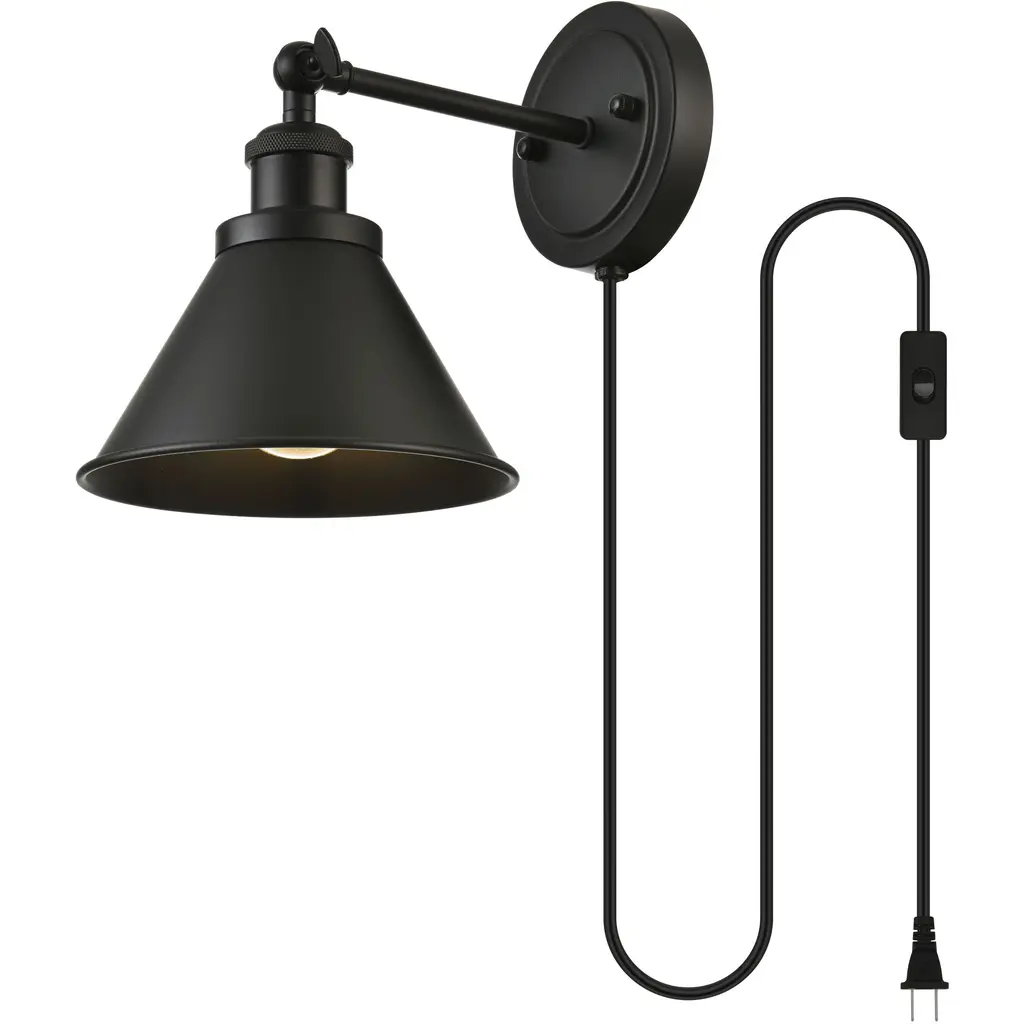 Simplicity and minimalism are the new forms of beauty when it comes to style and design. Shown in a metal shade, this wall sconce is versatile and can be placed in the bedroom, living room,entry way, or hallway. It is just what you need to shine a little light wherever you need it. Turn the lever at the top of the shade to adjust the lighting next to the bed or in the corner of your library. Compatible with dimmers, so you'll have the right amount of light in any given time of the day. Available in multiple finishes. Comes with a six foot long two prong power cord. Gently push the rocker switch directly on the cord to power on or off.