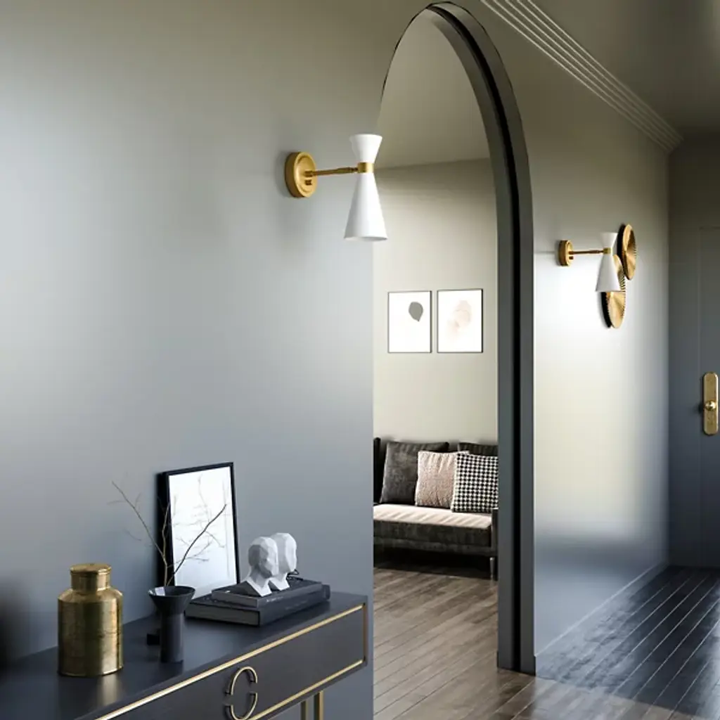 The Blake Wall Sconce by Alora Mood has a handsome, tailored look that was inspired by the form of a bowtie. With a formal feel, this design is anchored by a round backplate and supported by a simple arm that reaches outward. A smooth band wraps around the waist of a tapered shade that flares outward in either direction for a bold silhouette as it focuses a layer of illumination down onto its surroundings.