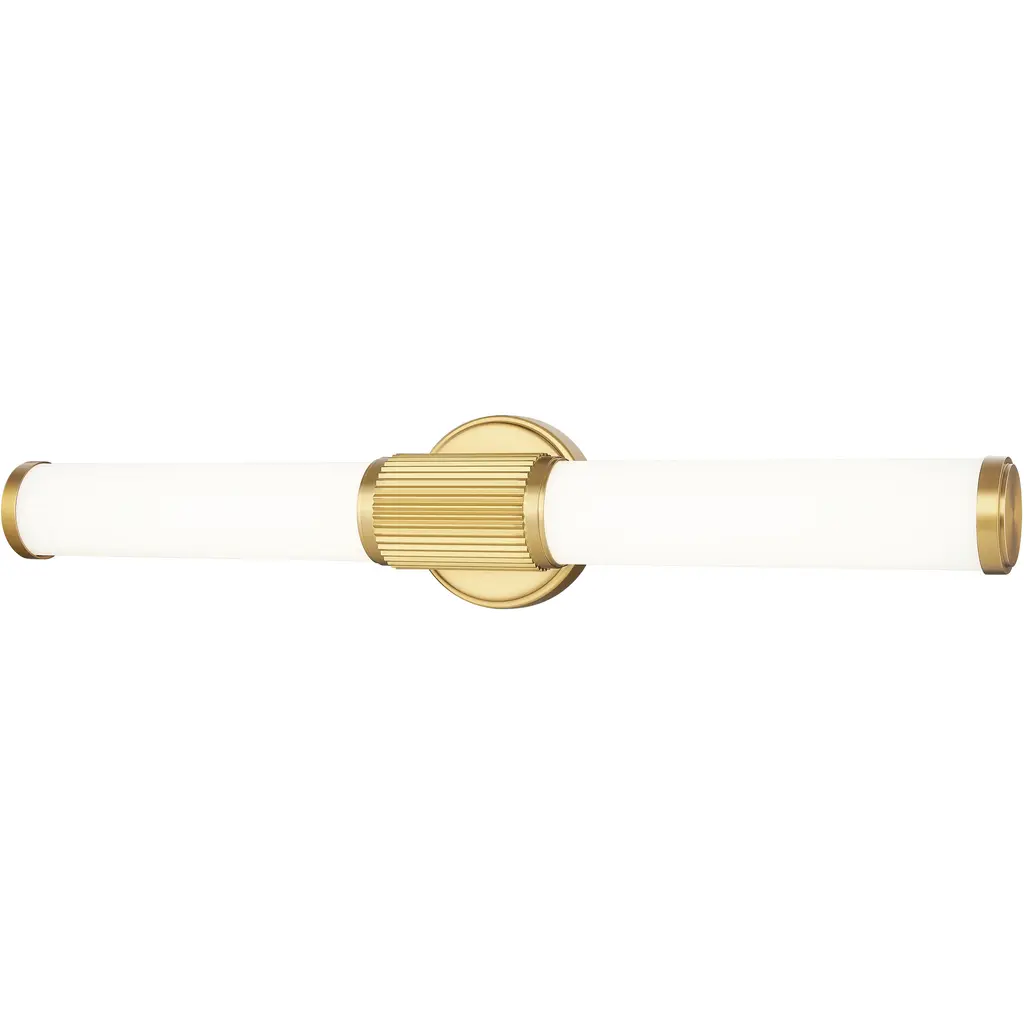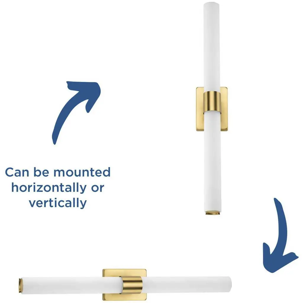 Enjoy this bath fixture's classic forms with crisp, contemporary updates. A silky, satin brass finish coats a simple backplate that anchors the light fixture in place. An elegant etched white glass shade shaped in a thin cylinder stretches horizontally across the design for a clean, modern demeanor.