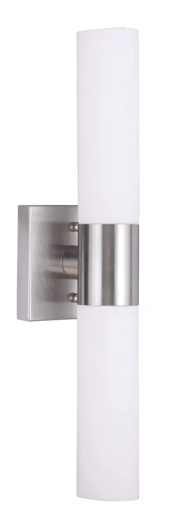 This LED wall bracket highlights classic forms with crisp, contemporary updates. An understated brushed nickel backplate holds a smooth, modern light base. Within the light base stands a cylindrical etched glass shade that evokes images of candlesticks.